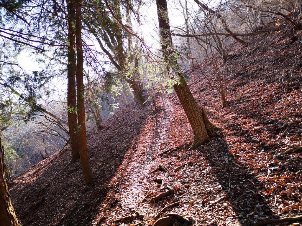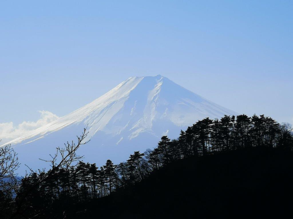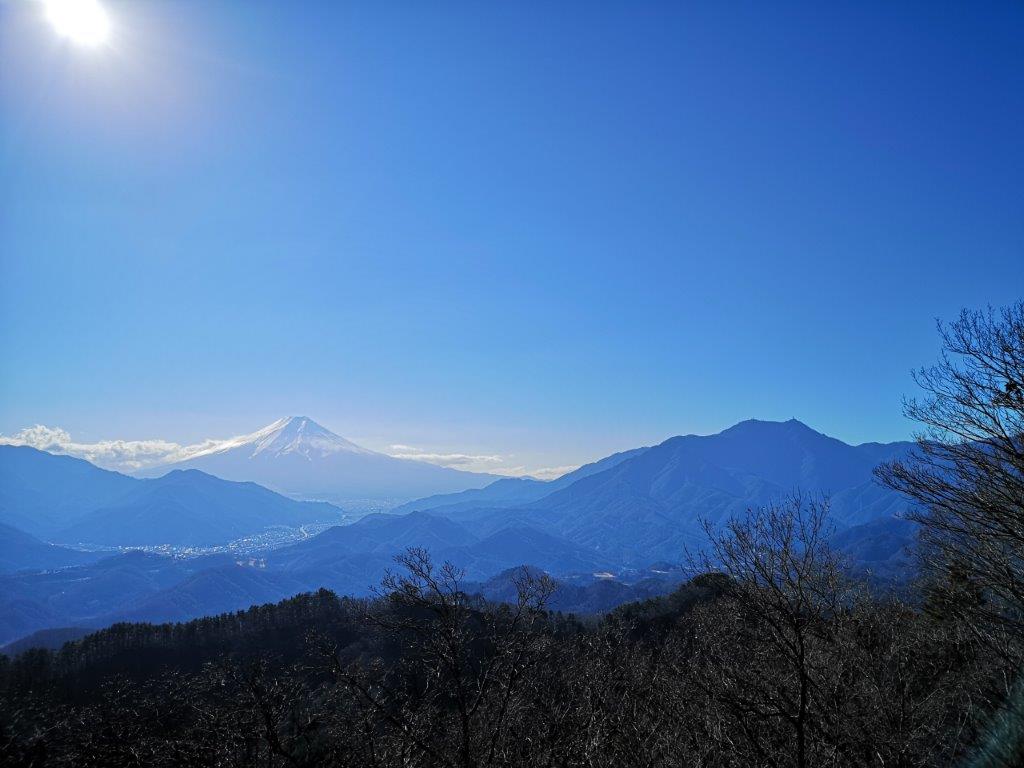 I rode the Chuo line limited express for a short hour to Otsuki station, where I changed to a local train to reach Hatsukari, one station away. The weather was as forecast, and the outline of Mt Takigo, opposite the station on the north side, was clearly visible against the blue sky. I set off just after 11am, first through the town, then along a forest road. By now the sun had risen high enough in the sky to shine through the trees on the northwest side, and despite the cold temperature, it felt pleasant walking through the forest.