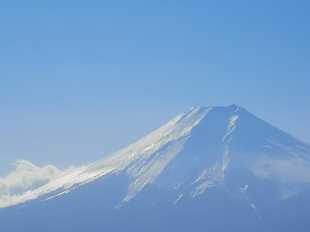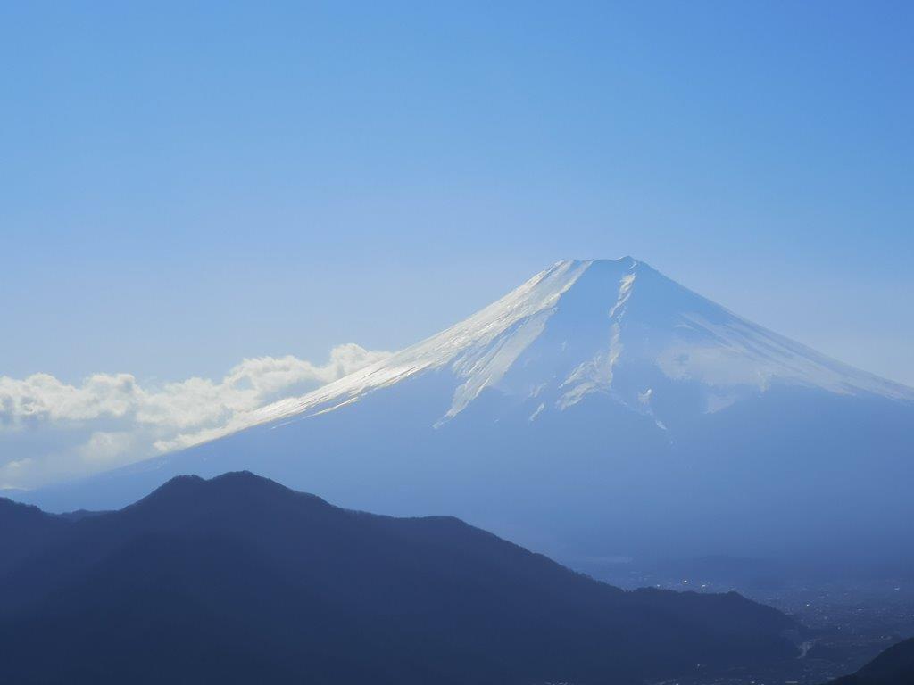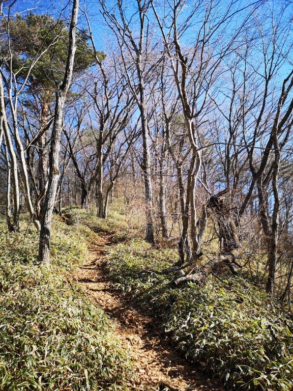 The trail doubled back and was now completely in the sun. Through the leafless trees, I had my first glimpse of Mt Fuji, its white summit rising above a ridgeline. After another fifteen minutes, I passed the top of the steep ridge I left earlier. The path turned around again and rose gently through bamboo grass and a sparse forest. A little before 1pm, I reached the top of Mt Takagawa (高川山 たかがわやま takagawa-yama), a 100 famous mountain of Yamanashi.