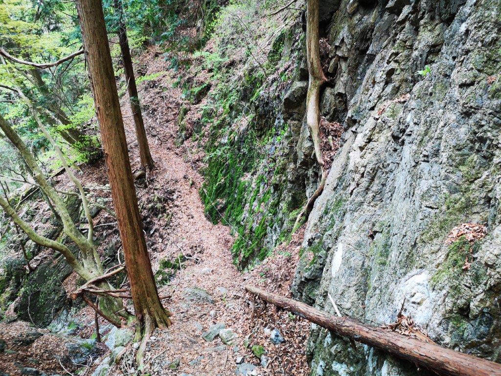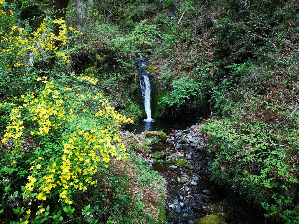 I walked along a level path surrounded by the new green of spring, here and there yellow Japanese buttercups adding touches of yellow. I passed the small “kiyotaki” waterfall (清滝), and after some gentle climbing, reached a small rest house, next to the slightly bigger “ryugataki” waterfall (竜ヶ滝). A little further, the trail split in two: I took the left branch as it included the trickier sections best tackled on the ascent; later on, I would descend via the right branch. The path suddenly became steep and rocky, and required more careful walking. I arrived at a second rest house just before 11am where I took a break.