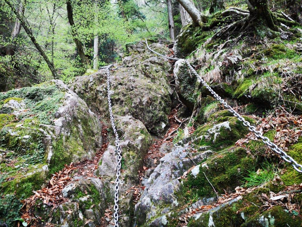 Rocky section fitted with chains on the way up