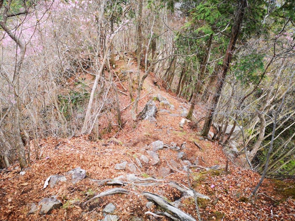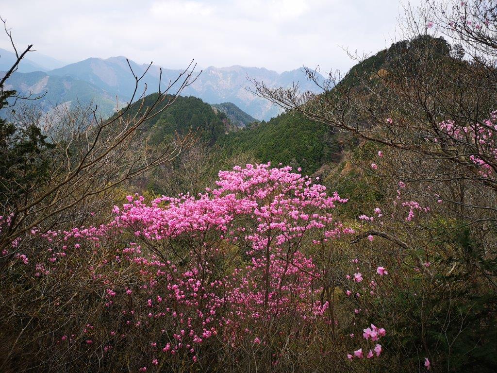 The chains and ladders soon reappeared, and there was even a short bridge along a narrow ridge with steep drops on each side. All this equipment seemed new and securely fastened, and for a while, I could enjoy the thrilling aspect of walking along the side of a rocky cliff, the thick vegetation masking the views and providing a false sense of security. Here and there, I could see pink rhododendron (“shakunage“), the flowers being in bloom precisely at this time of the year. At 11h3o, I reached the ridge top with a sense of relief and a few minutes later, I was standing on top of Higashi Kennomine (東剣ノ峰) where I had a view of today’s first summit directly north.