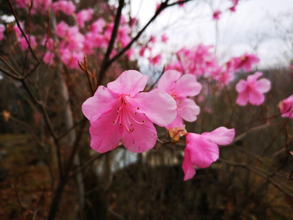 It felt chilly, almost as if winter was making an encore. I sat down for a quick lunch before resuming my hike. At 1pm, I reached the summit of Mt Gassan (or Tsukiyama 月山, meaning “moon mountain”). It had a lichen-covered shinto gate, a bunch of shakunage flowers and an old thermometer attached to the summit sign, the mercury level showing just below the 10° mark. After a short break, I descended a steep rocky ridge, then turned right onto a switchback path through cedar trees. I reached another chain-fitted rocky bit, at the back of the large group I met on the summit. They graciously let me pass ahead of them; I had to be doubly careful not to make a false move in front of an audience.