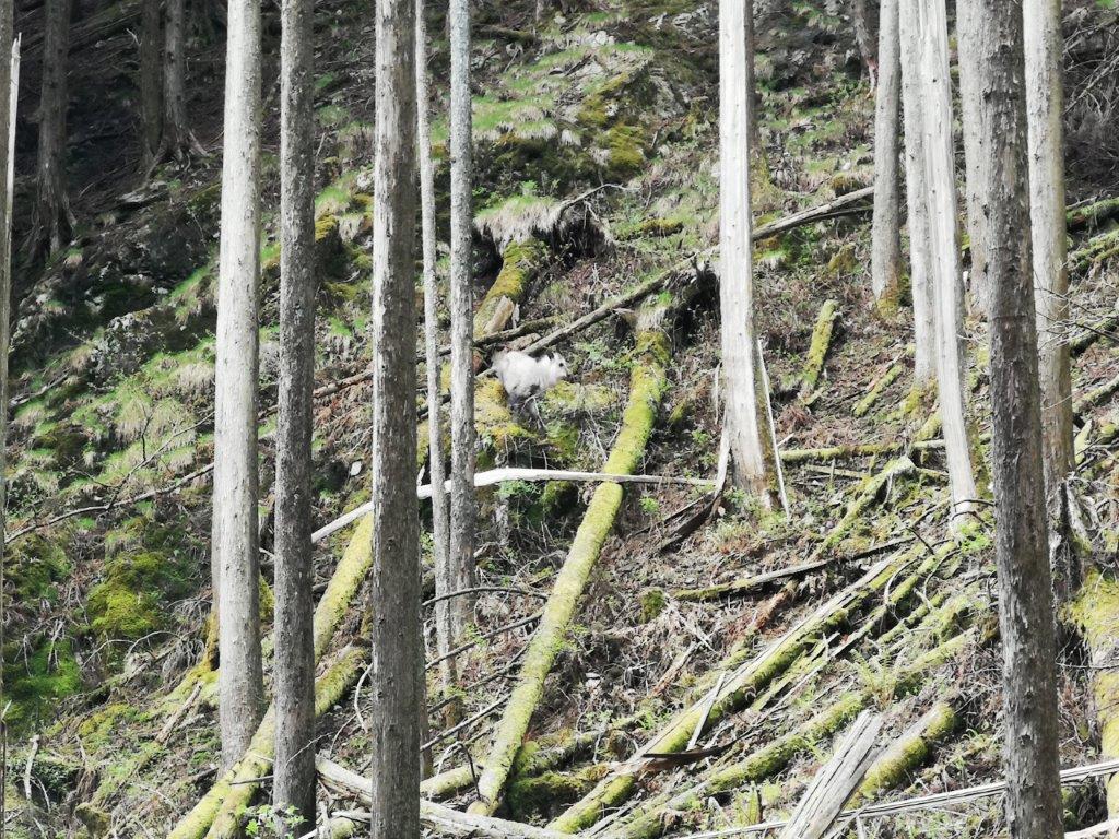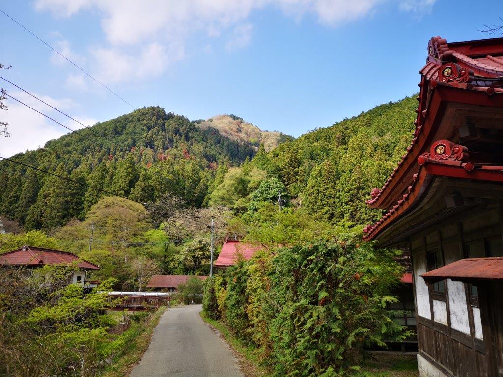 I was now walking through an impressive canyon, a rock face on my right and a small stream on my left. Eventually, it widened into a valley, the new green of spring reappearing at the lower altitude. Out of the corner of my eye, I spotted movement high on the opposite slope – a solitary “kamoshika” or Japanese serow, munching on the new leaves; I hadn’t seen one since Mt Kushigata, three years ago. After observing this rare and magical sight for a while, I moved on quickly; I was still on schedule, but couldn’t afford to miss the only bus of the afternoon. On the opposite side of the valley, I noticed scores of fallen trees, probably due to the powerful typhoons of recent years; looking up through the gap in the forest, I saw blue sky, at last.