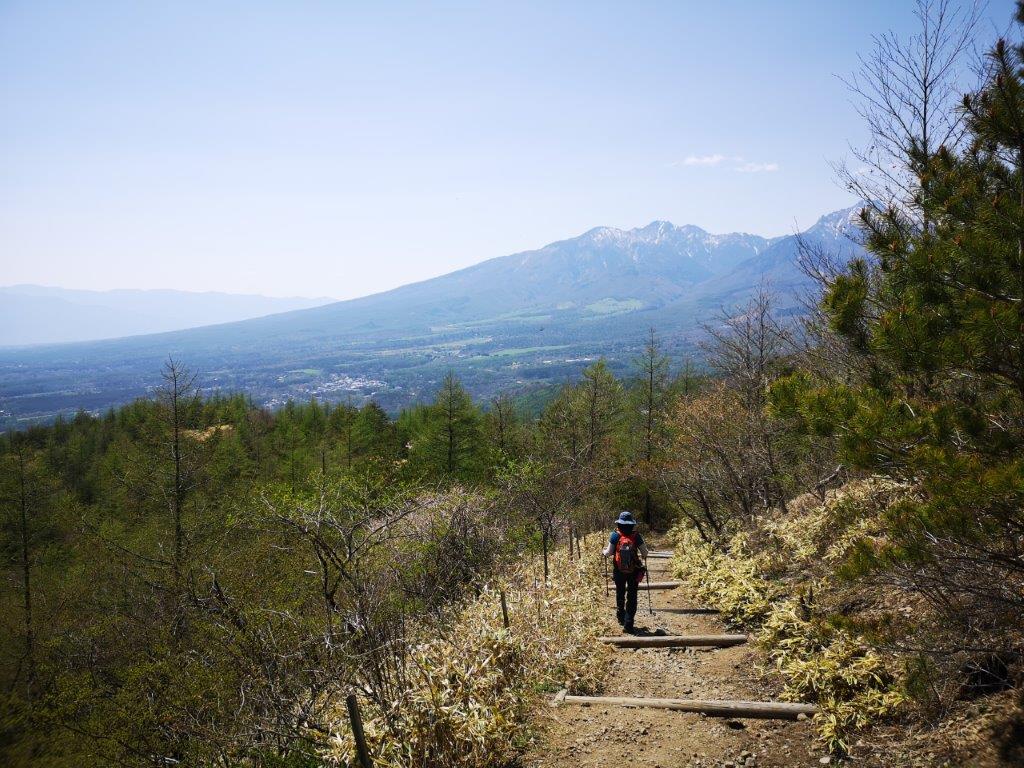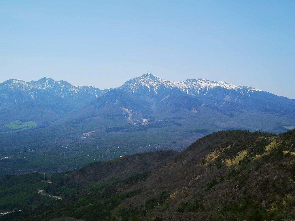 I has some a great side view of Yatsugatake during the ten-minute ride to Hirasawa pass (平沢峠); although the surrounding countryside was bright green, the higher reaches of this ancient volcano were still of a brilliant white. Before starting my hike, I checked out the rocky formation of Shishi-iwa (しし岩 meaning lion rock); standing on the highest rock, I could see the Minami Alps to the south. After a short climb, I passed the flat summit of Mt Hirasawa (平沢山 1653m), from where it was a mostly an easy, level walk to a trail junction. I went left and after a short climb, arrived at the exposed and windy peak of Mt Hiramori (平盛山 1643m).
