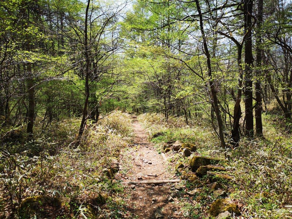 After enjoying the panoramic view, which included a faintly visible Mt Fuji, I headed down the western side; surrounded by pine trees and facing a view of the Alps on the left and Yatsugatake on the right, I almost felt like I was hiking in the Swiss Alps. At 1h30, I arrived at an intersection with a forest road near an open shelter. Here, I was delighted to see some cherry blossoms near full bloom, since I had thought I had already seen the last ones of the season. I continued down the path through green forest and soon arrived at a road outside a village. Beyond, the road descended into a river valley and then up the other side.