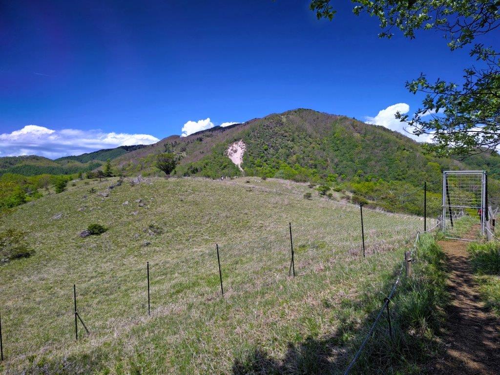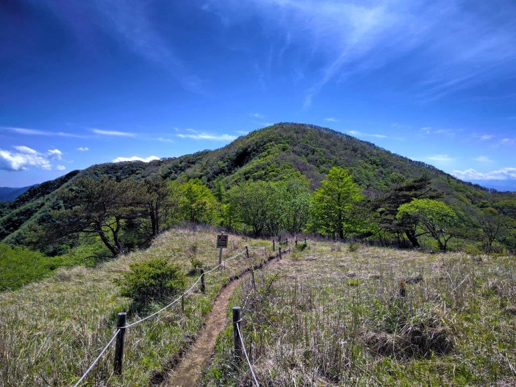 I was soon heading up one of the most beautiful river valleys I had ever walked, made especially beautiful by the sunshine filtering through the new green of spring; few hikers, several river crossings and some fallen trees along the path made it quite adventurous as well. I could hear the croaking of toads, hiding under the mud, and the song of birds, hiding in the trees. A little before 1pm, I reached Yunosawa Pass, which had a parking area and a restroom. At a T-junction, I took the right branch and soon reached a grassy ridgeline.
