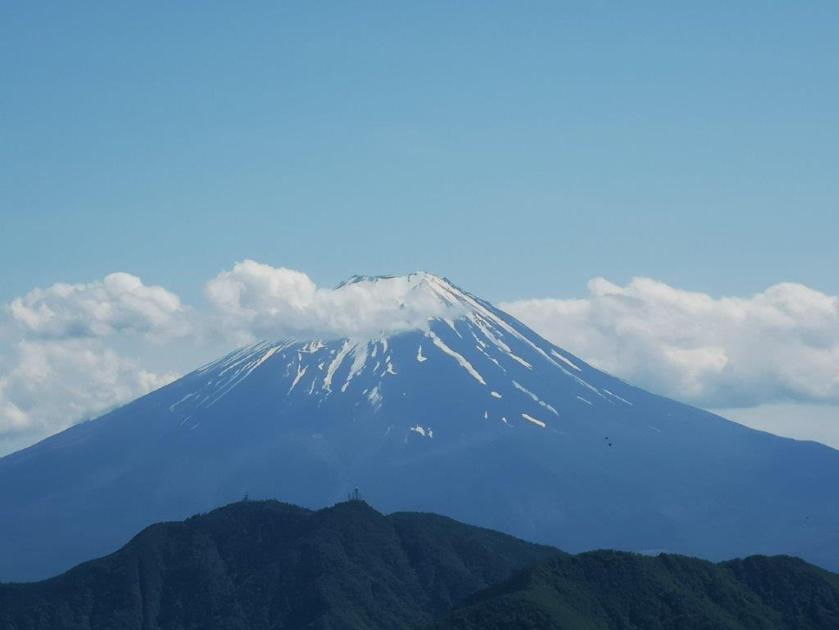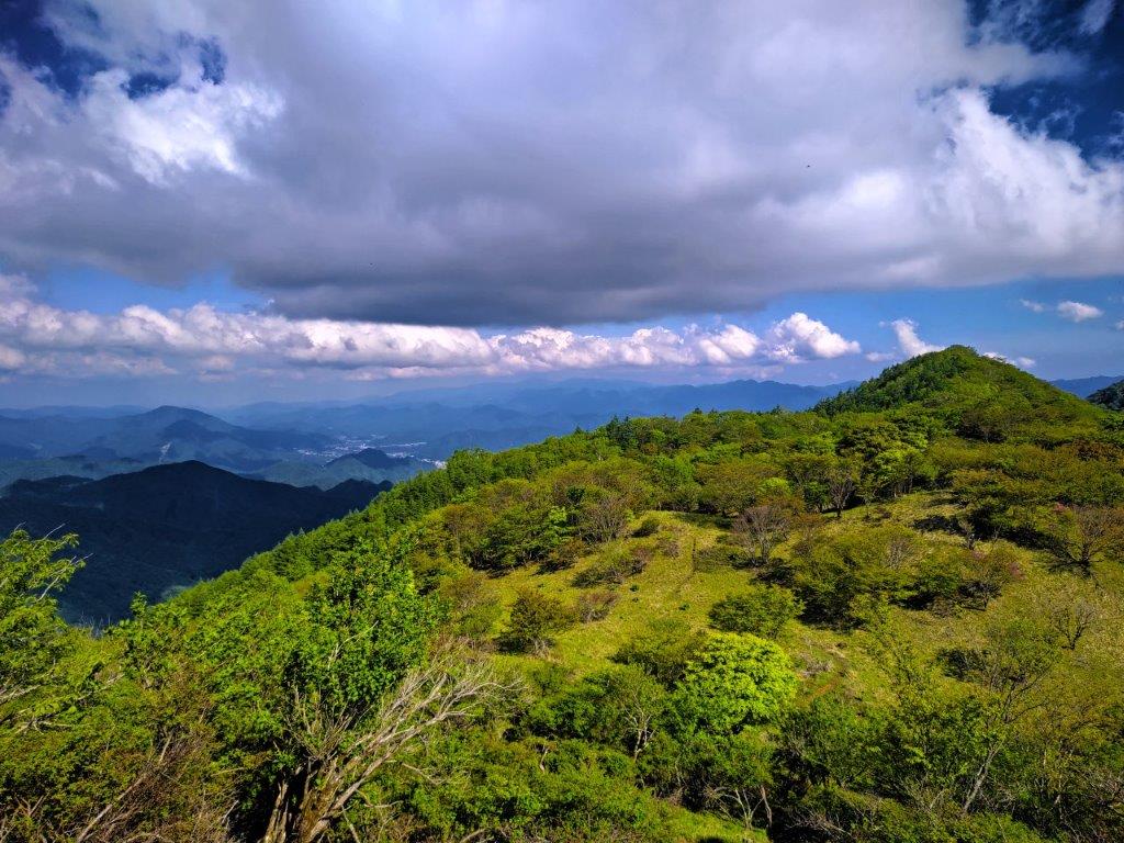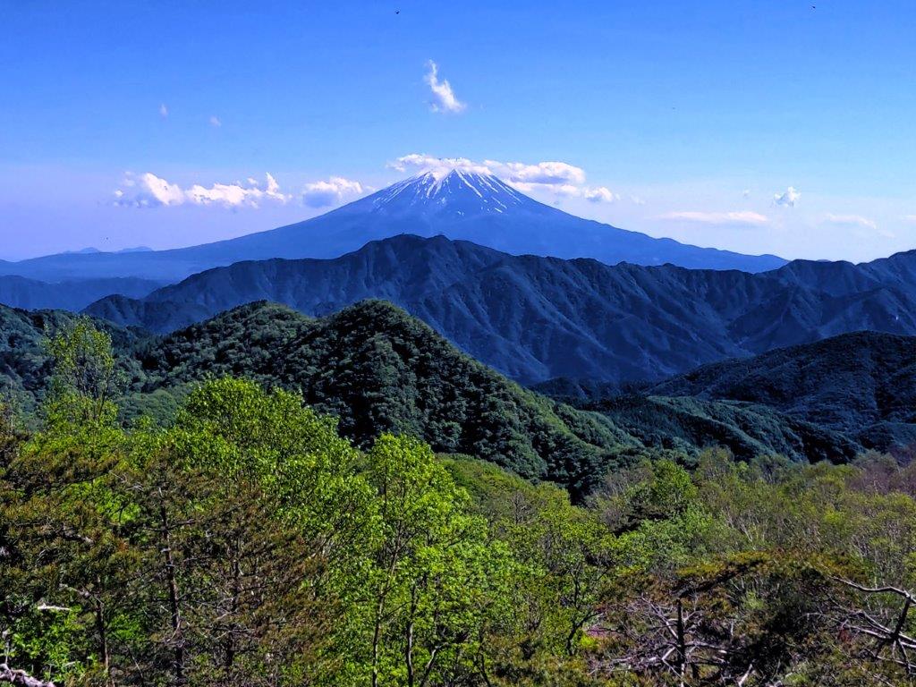 The trail was easy to hike and easy to follow; I had excellent views in all directions. Huge cumulus clouds passed overhead and made me worry slightly about a sudden downpour. At 2h30, I reached Mt Hamaiba (ハマイバ丸 はまいばまる hamaibamaru), another “round” summit. Although this summit was mostly in the trees, Mt Fuji could be seen through a gap on the south side. After admiring Japan’s most famous mountain, I set off again. The path started to descend, and one hour later, reached Komeshoi Pass (米背負峠). There, I turned right, down another river valley.