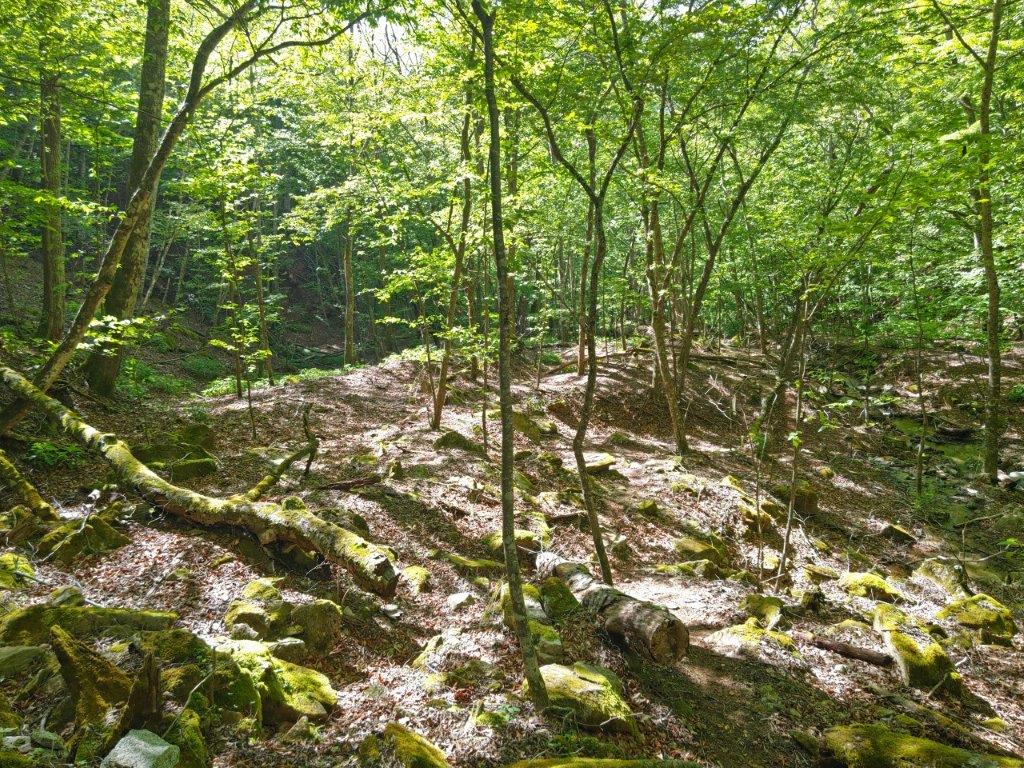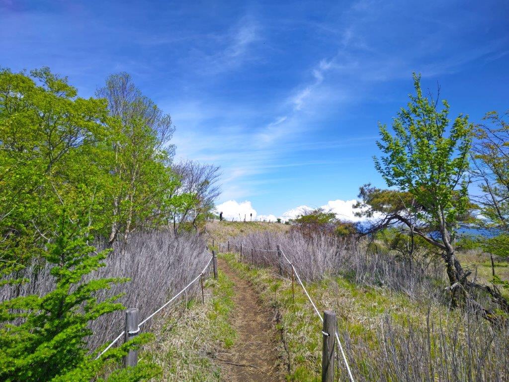 I was soon heading up one of the most beautiful river valleys I had ever walked, made especially beautiful by the sunshine filtering through the new green of spring; few hikers, several river crossings and some fallen trees along the path made it quite adventurous as well. I could hear the croaking of toads, hiding under the mud, and the song of birds, hiding in the trees. A little before 1pm, I reached Yunosawa Pass, which had a parking area and a restroom. At a T-junction, I took the right branch and soon reached a grassy ridgeline.