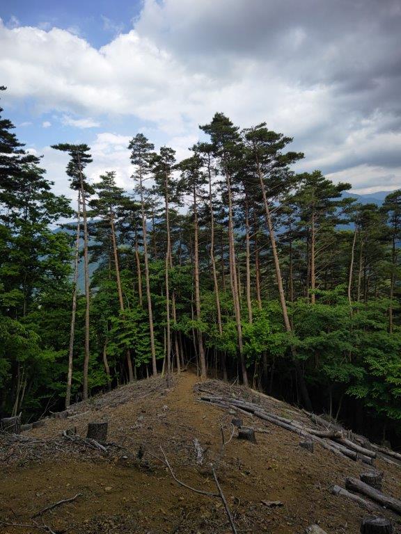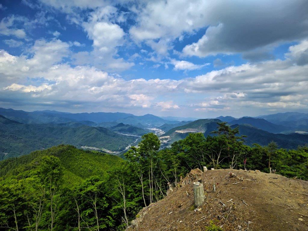 Here, I had a sweeping view north and east, as the trees had been cut, and upon reaching the top of a knoll, I sat down on a stump for a late lunch. To the north there was Mt Takigo, and behind, its summit in the clouds, Mt Gangaharasuri; to the east Mt Iwadono, Mt Momokura , and Mt Takagawa, surrounding Otsuki city; further south, I spotted Mt Kuki, Mt Imakura, and the Tsuru Alps, beyond Tsuru city. The latter was my final destination and it seemed still quite far; on top of that, many low dark clouds had gathered in that direction, hiding the highest peaks of the Doshi mountains.
