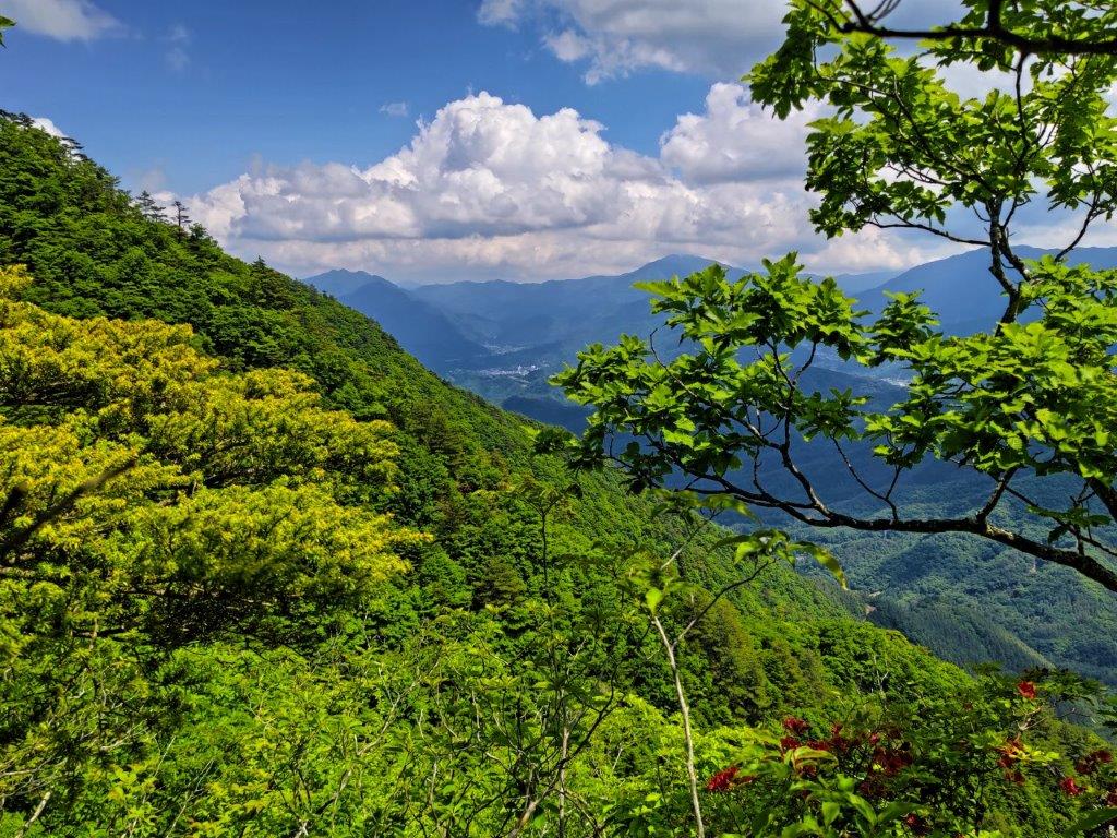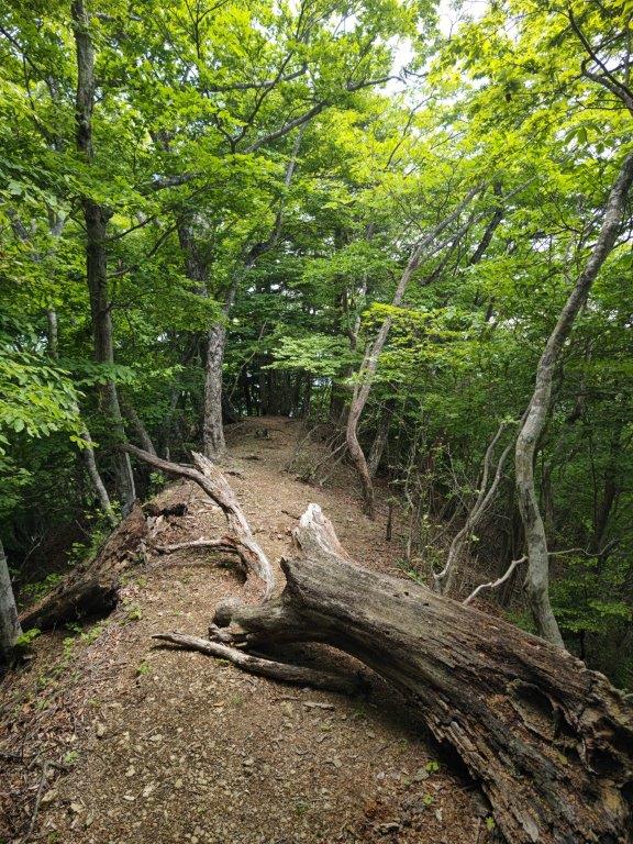 I followed an undulating path through low, bright green trees; I saw no-one and felt far from the world. Just before 1pm, I had a view through a break in the trees: to the west was Mitsutoge, and to the east, the Doshi mountains. I continued on my way, enjoying the peace and quiet of this little hiked trail, and 15 minutes later reached the summit of Mt Tsurugatoya (鶴ヶ鳥屋山 つるがとややま tsurugatoyayama). It was in the trees, so I moved on without a break. The trail headed down steeply, the rocky sections equipped with ropes; I soon emerged onto a road, but picked up the trail again, 50 meters on the right.