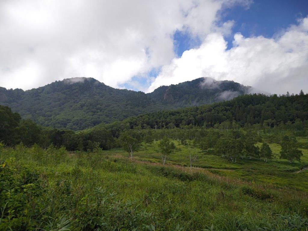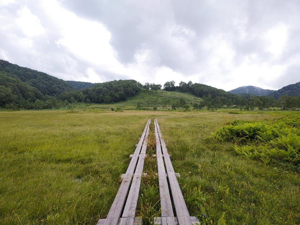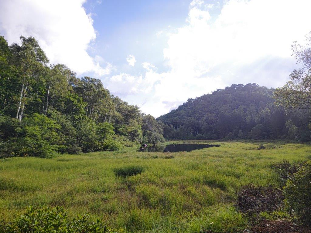 I rode the Hokuriku shinkansen under blue skies, enjoying the views of the mountains surrounding the Kanto Plain. After getting off at Nagano station, I boarded the limited express for the one hour ride to Yudanaka, where I switched to a surprisingly empty bus for Shibutoge (渋峠); a little before 11h30, I finally got off at Kidoike Pond (木戸池 1620m, meaning “Wooden Door Pond”). After getting ready, I set off on a wooden walkway next to the lake side, but very soon made a sharp right up a short slope, leading to the top of a grassy rise.