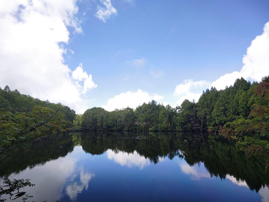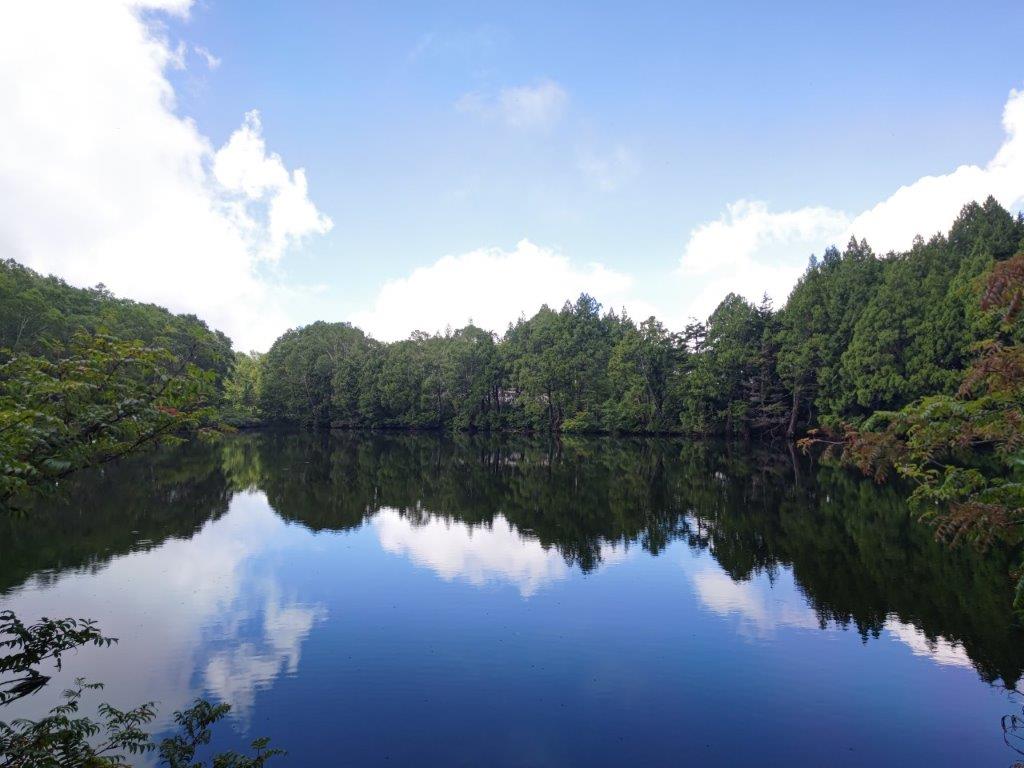 As I approached the lake, I marveled at the reflection of blue sky and fluffy white clouds on the perfectly still water surface, the low clouds having temporarily parted. I continued along the gently undulating path through thick forest and soon arrived at Kami-no-koike Pond (上の小池 1570m), a lot smaller than the two previous ones. At 12h30, I was walking the length of the narrow Nagaike Pond (長池 1584m, meaning “Long Pond”) while observing the mad dance of the dragon flies.