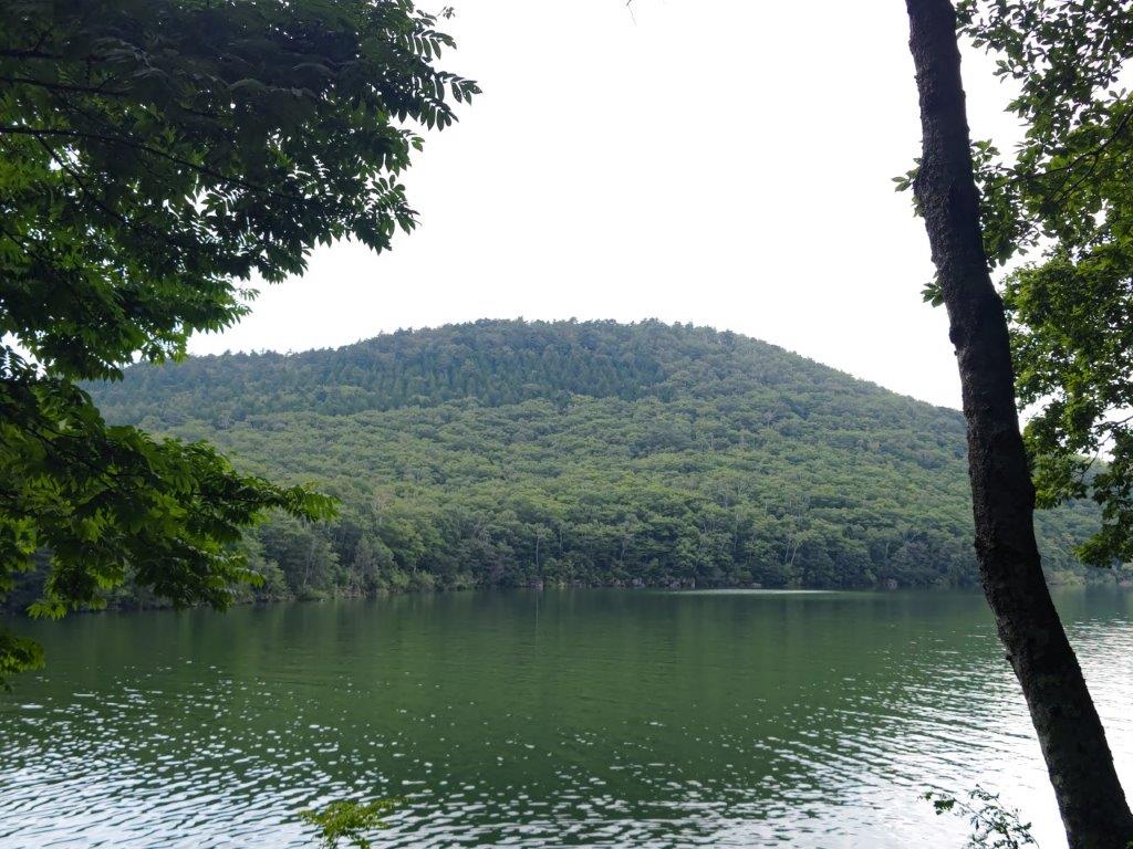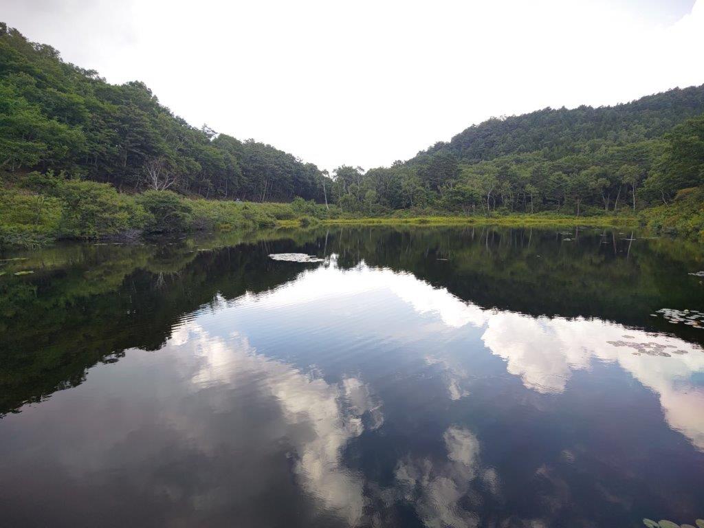 At the other end of the lake, I was mesmerised by the reflection of the white facade of Shiga Lake Hotel. I popped into the nearby Shiga Kogen Yama no Eki (志賀高原山の駅), a mountain roadside station, to check their flower chart. I crossed the road once more, and after descending through the forest, reached Biwaike Pond (琵琶池 1390m), the largest lake so far. Through a gap in the trees, I had my first view of today’s mountain, a flattish peak rising above the opposite shore. I was hoping to have lunch there, it was already 2pm, but before that, I passed by Ichinuma Pond (一沼 1410m), the prettiest pond of the day.