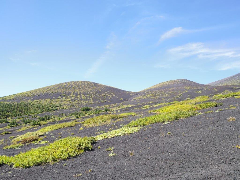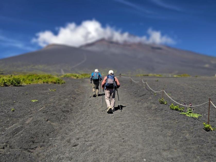 It seemed like a perfect day to climb to the top, which felt tantalizing close, even though it was 17oo meters higher. I quickly reached a junction at Oishi-Chaya (大石茶屋), where I took the left branch, heading towards a gap between two pimple-like mounds protruding from the volcano side. I slowly treaded up the sandy path, often stopping and turning to take in the soaring views; north, I could now see the light blue waters of Yamanaka lake, emerging from behind a light-green ridge. At 10h30, I reached the wide, flat top of Mt Futago (双子山 ふたごやま futago-yama, also called Futatsuzuka-Shitazuka 二ツ塚下塚).