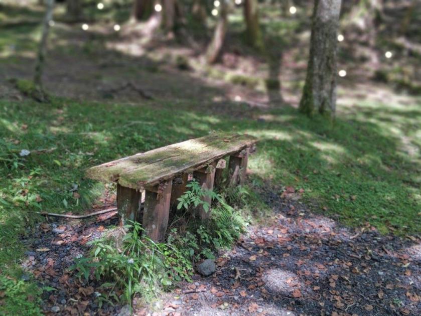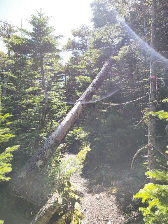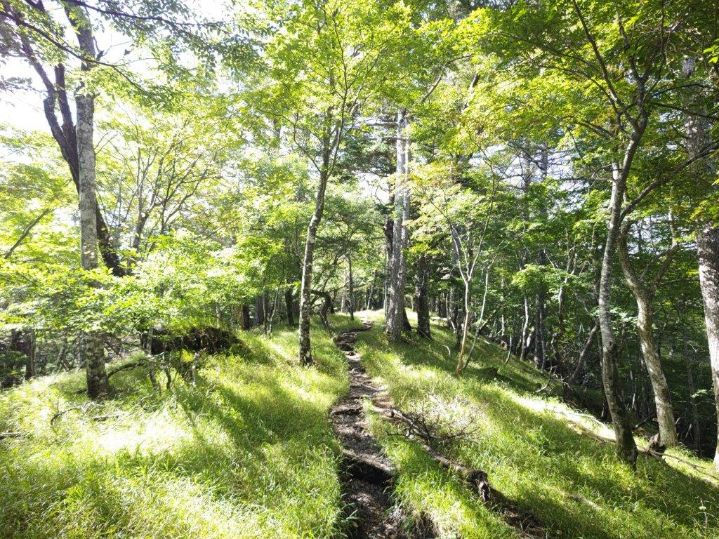 It felt amazing to walk this mostly level, panoramic trail at an altitude of nearly 2000 meters. A little before noon, I arrived at the entrance of Goten Garden (御殿庭入口). From this point, the feel of the hike became completely different, as I made me way through a dense mixed forest, on a narrow and faint path. However, this section was equally enjoyable, as the midday sun amplified the various shades of green, from the dark green of the pine needles to the light green blades of the grassy forest floor. I soon arrived at a junction at the base of Goten garden (1977m 御殿庭下). I found a fallen tree in a sunny clearing, and sat down for an early lunch.