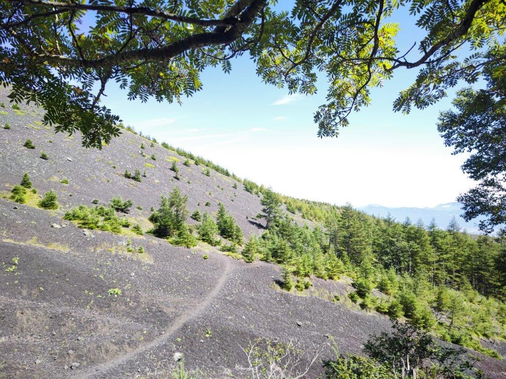 It was hard to believe I was more than halfway up Japan’s highest mountain, as I was completely surrounded by trees; it was also eerily quiet, except for the background hum of insects. At 12h30, I headed down the steep Suyamaguchi hiking trail (須山口登山道), also the “D route” of the Nature Recreation Forest Trail. As the altitude dropped, I got to enjoy the change in the surrounding nature, from a thick, impenetrable pine forest, to a roomy, shady birch forest. After nearly an hour of descending, I reached another junction at about 1600m, where I turned left, along the “E route”, heading back to my starting point.