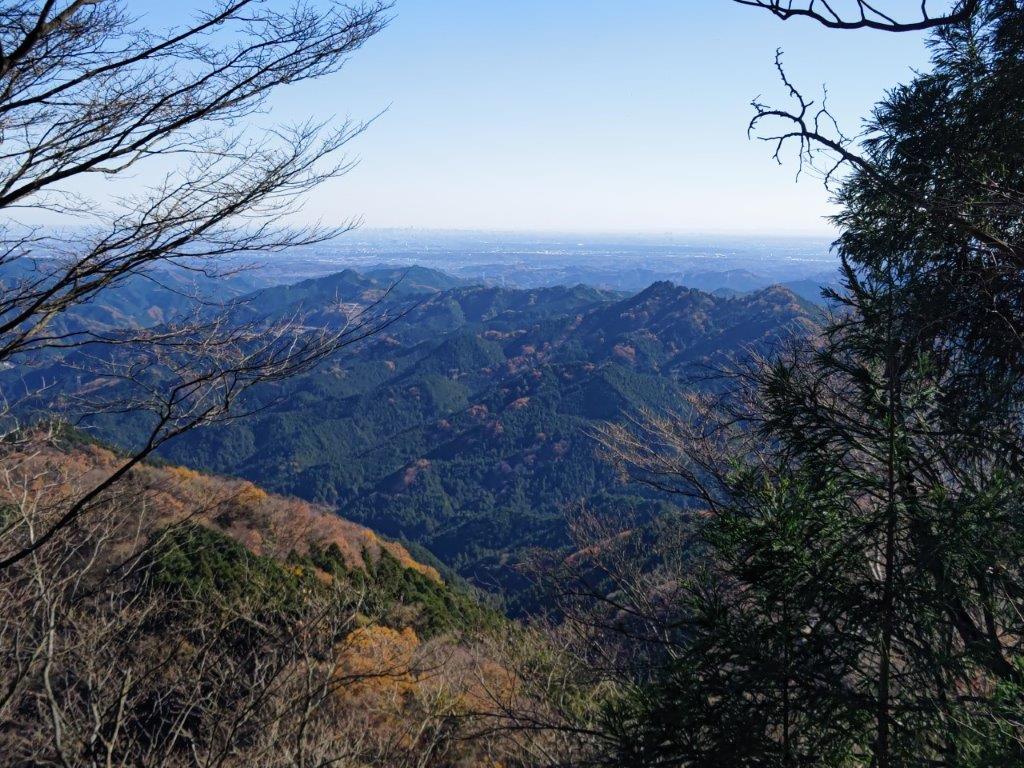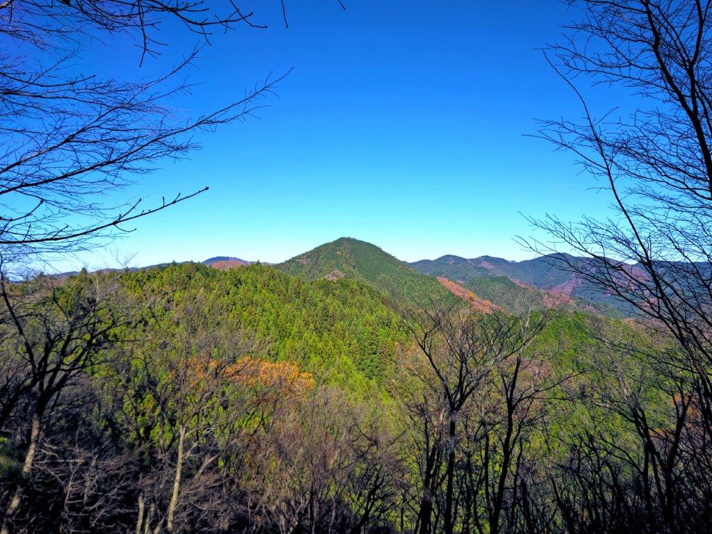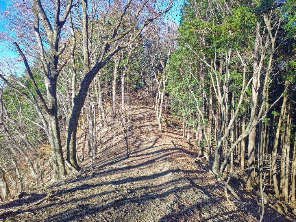 I followed the gently undulating ridgeline, the bare forest surrendering occasional glimpses of forested hills. I was now walking on the well-maintained Kanto Fureai no Michi. At 1pm, I reached a teahouse at Shomaru Pass (正丸峠) where I had a view of the valley leading to Shomaru station. I crossed the road, rejoining the hiking trail, and passed an arbor, the surrounding view mostly blocked by the trees.