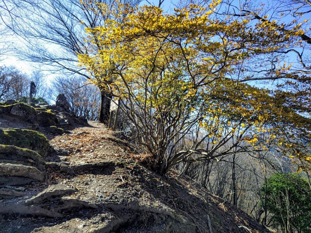 It was a sunny autumn day as I rode the Seibu Laview from Ikebukuro. At Nishi-Agano, I transferred to the Seibu-Chichibu line for the one-station ride to Shomaru station. A little after 10 am, I set off on a paved road along a stream, and soon reached the start of the hiking trail under a massive, orange Japanese maple.