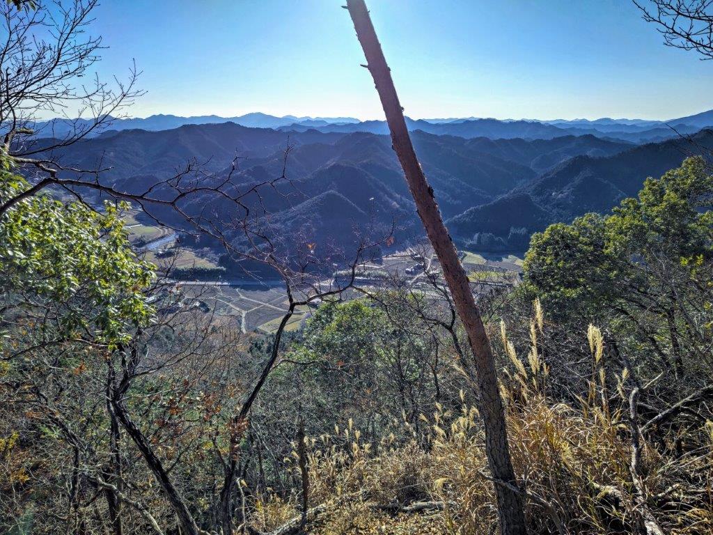 A little after 10am, I started up the trail, following a stream, and soon turned right up the Shimozawa trail (下沢コース). A steep switchback path through the forest led to the ruins of Shimozawa castle (下沢城跡 368m) where I had view north of the other side of the valley through a gap in the trees. The path then descended for a while to Fudo rock (不動岩) before heading up again. Around 11h30, I arrived at an area clear of trees around a small white building that served as a TV antenna.