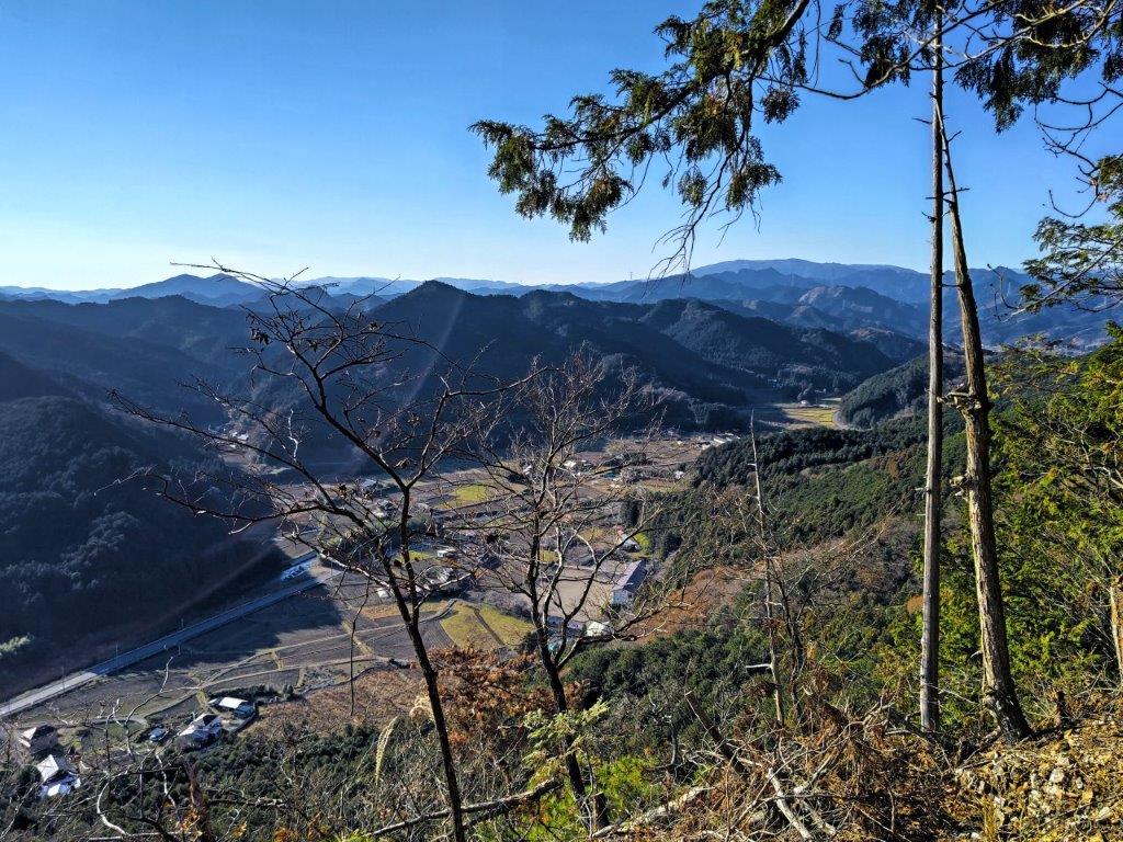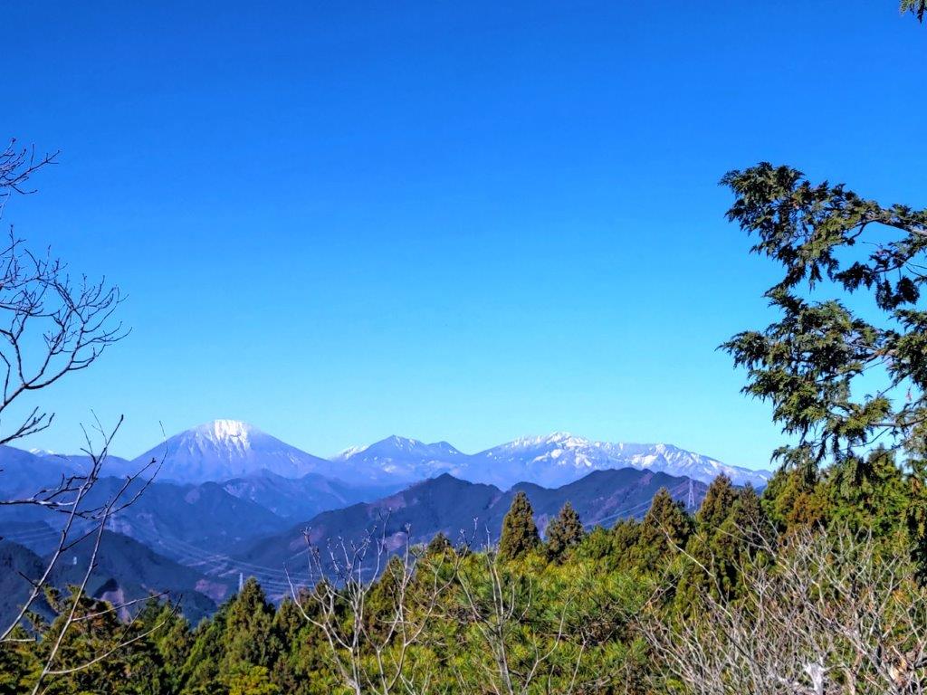 A little after 10am, I started up the trail, following a stream, and soon turned right up the Shimozawa trail (下沢コース). A steep switchback path through the forest led to the ruins of Shimozawa castle (下沢城跡 368m) where I had view north of the other side of the valley through a gap in the trees. The path then descended for a while to Fudo rock (不動岩) before heading up again. Around 11h30, I arrived at an area clear of trees around a small white building that served as a TV antenna.