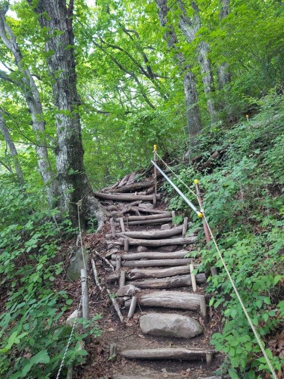 I followed a path in the shade of towering cedars before finally reaching the start of the trail. At first the logs steps were easy to climb, but they gradually got more chaotic as I reached the steepest part of the climb. However, it never got so tough that I couldn’t enjoy the green spring forest. Just past 11h30, I reached the first viewpoint of the day, on the east side, near a row of small Buddhist statues.