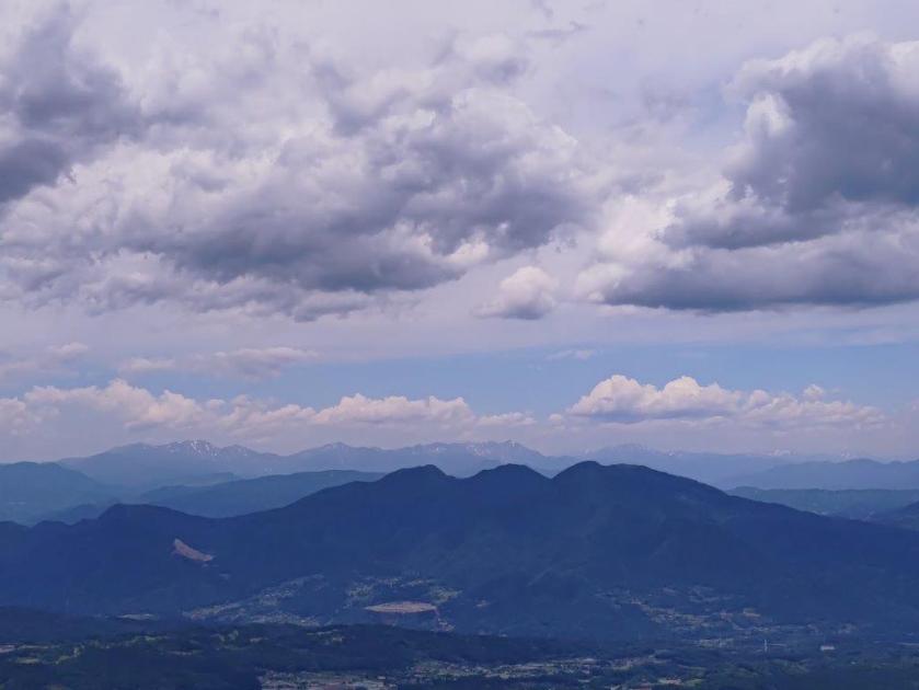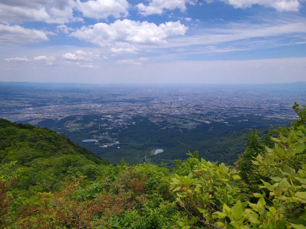 In the distance, I was surprised I could make out Mt Sennokura and Mt Tanigawa, still wearing their winter coats, the haze having already returned just two days after heavy rain. A little further, I reached the top of Mt Mizusawa (水沢山 みずさわやま mizusawa-yama), its prominence barely noticeable along the ridgeline, but with a spectacular 360° panorama. Directly ahead on the west side, I could see the highest peaks of Mt Haruna. To the southwest, were the Chichibu mountains, and to the southeast were Mt Kusatsu-Shirane, Mt Shirasuna and Mt Naeba (climbed in June 2015), its white, flat peak only just visible. It was past noon, so I sat down for some lunch.