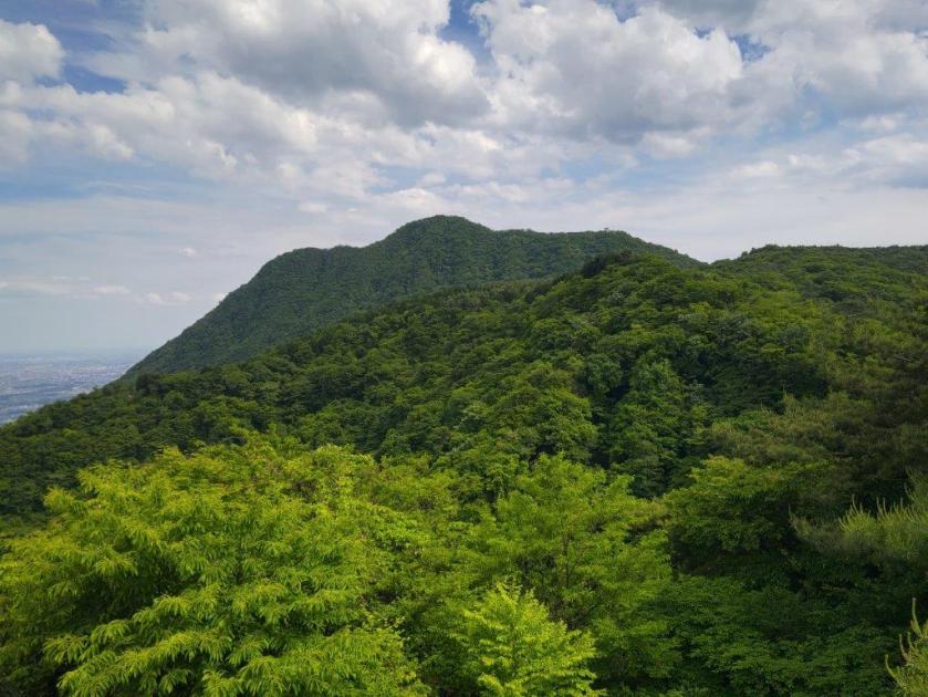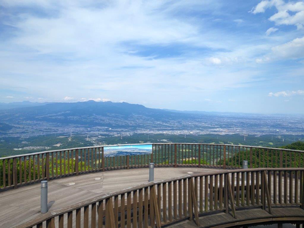 After I had my full of the spectacular view on this sunny day, I set off again, around 1h30. After some descending along the forested, rocky ridge, I reached a paved road, and there, turned right along the path for “Tsutsuji-ga-oka”, or Azalea hill, although they were now out of season and no flowers could be seen. I soon reached an open shelter before another road crossing, where I had an impressive side view of the peak I had just climbed. I continued along the easy-to-walk trail, and at 2h30, arrived at the “Tokimeki Deck”, a wooden observation deck near the top of the Haruna Ropeway.