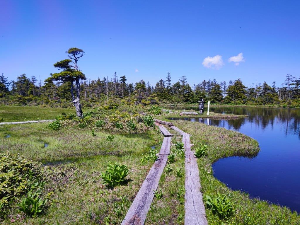 I soon arrived at a stunningly beautiful pond, chigoike wetland (稚児池湿原); although it was shown on my map, I hadn’t expected anything like this. I had also arrived at the summit of Mt Yakebitai (焼額山 やけびたいやま yakebitaiyama). After some lunch, I dropped my pack and did tour of the wetland, following the walkway counterclockwise. On the west side, Mt Kurohime and Mt Myoko rose majestically from the edge of the grassy wetland. On the east side, I emerged from the forest onto another ski slope, looking totally different from the time I was there on skis.