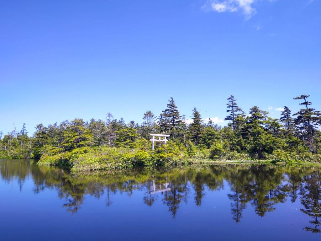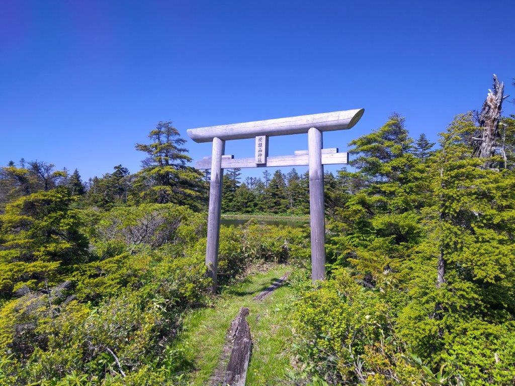 I had another amazing view, this time of the mountains of Niigata, many of them yet to be climbed. From left to right, I could see Mt Torikabuto, Mt Naeba, Mt Shirasuna and Mt Iwasuge, its side view resembling a ship. It was already 2h30 so I quickly completed the loop, passing near a small shrine and its wooden “torii” (Shinto Gate), looking quite magical among the pines, next to the pond. A little before 3pm, I set off for the return, reaching the top of Mt Ryuo (竜王山 りゅうおうさん ryuuousan) less than an an hour later. Sadly the path to the summit was overgrown by vegetation and view of Shiga Kogen to the south was mostly hidden by trees. I could only stay a few minutes till swarms of insects forced me to retreat.
