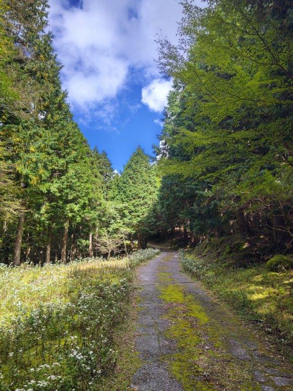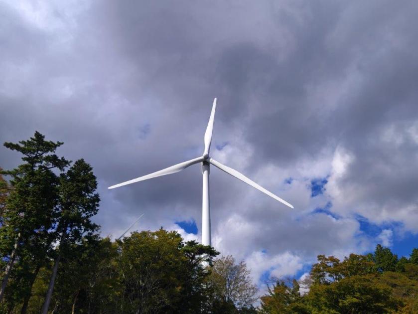 It was overcast when I finally set off, a little after 11am, along a paved road through the forest. I was the only person on the trail; I supposed that most people had flocked to places with autumn colours. Half an hour later, I reached a clearing from where I could see the ridgeline of Mt Amagi. Through a break in the trees on the right, I had a glimpse of the wind turbines below.
