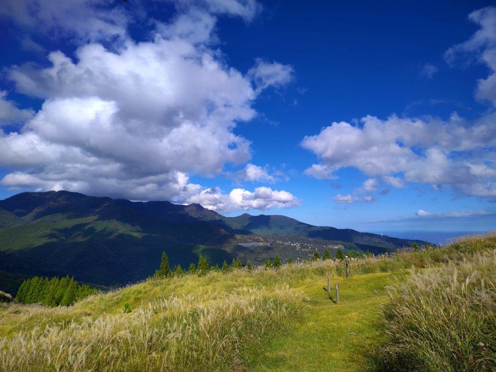 The weather was slowly improving and now the sun had the upper hand over the clouds. The trail alternated between paved road and hiking paths. The view gradually opened up on both sides: turning around, I could see the entire range of the Amagi Volcanic Range on the west and north sides; to the south, I could see the top of Mt Chokuro; looking east, I could see the Pacific Ocean and Oshima Island.