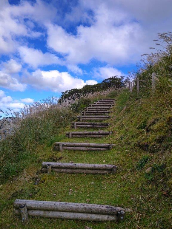 After enjoying the view, I took the left trail heading directly down the grassy side of the mountain; another trail continued south along the wind turbines, but that would be for another day. I met more and more people, who had mostly come to see the autumn “suzuki” or Japanese pampas grass, and had decided to push on to the highest point. Soon I reached another fork where I went left, following the shortest route down.