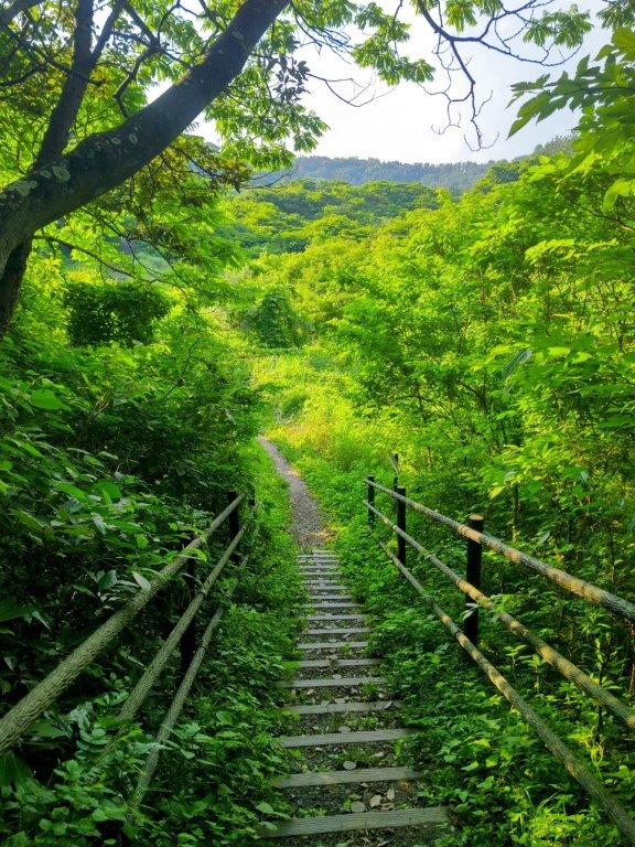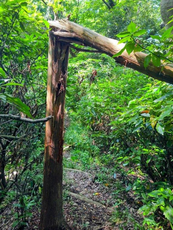 I was surprised to see a small stream running alongside the path, its temporary existence due to the previous night’s heavy rains. I left the park behind and followed a busy road southwards, soon reaching the entrance of another trail. After a short, steep climb, I reached the top of a narrow, up and down ridge. Although there were few views, I was glad to be in the shade during the hottest time of day. I soon passed the minor summit of Mt Gongen (権現山 138m), devoid of a summit marker and a view, so I continued without a break, now heading down.