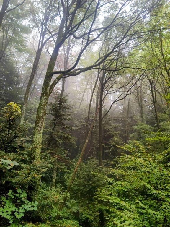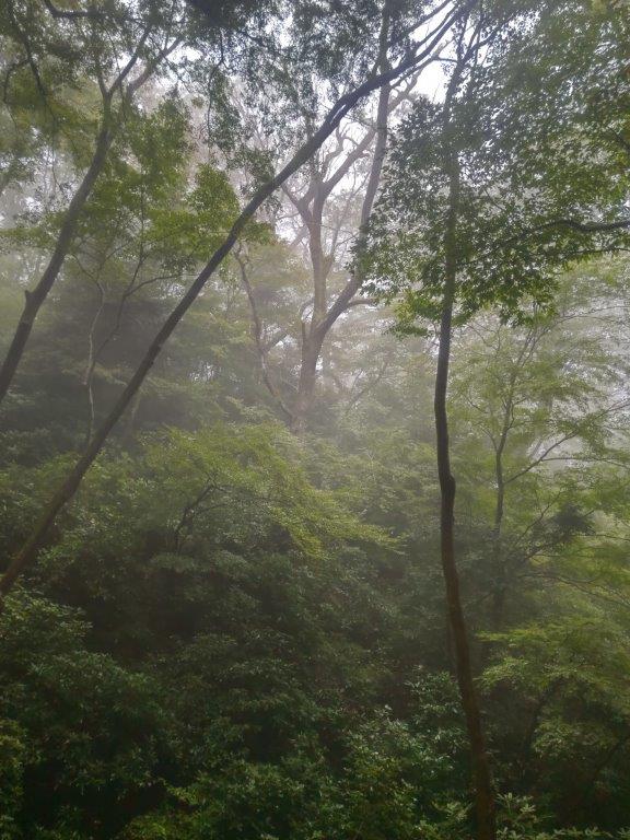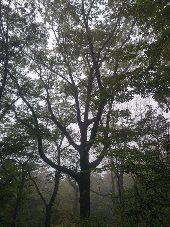 I was surprised by how humid it still was, as I didn’t expect to break a sweat in such a short time. At 3pm, I reached a flatter section on a shoulder of the mountain, the surrounding forest shrouded in mist. Soon I was climbing again, the trail wet and slippery because of yesterday’s rain. I arrived at the intersection with the Suspension Bridge Trail (trail #4), explored four months ago. I continued along the Iroha Forest Trail, making my way up a series of wooden staircases, eventually merging with the Omotesando Trail (trail #1). I now had to share the path with dozens of other people, as well as huge Jorogumo spiders, hanging from immense webs on both sides of the trail. At 3h30, one hour after setting off, I reached the top of Mt Takao (高尾山 たかおさん takao-san), the view consisting entirely of white space.