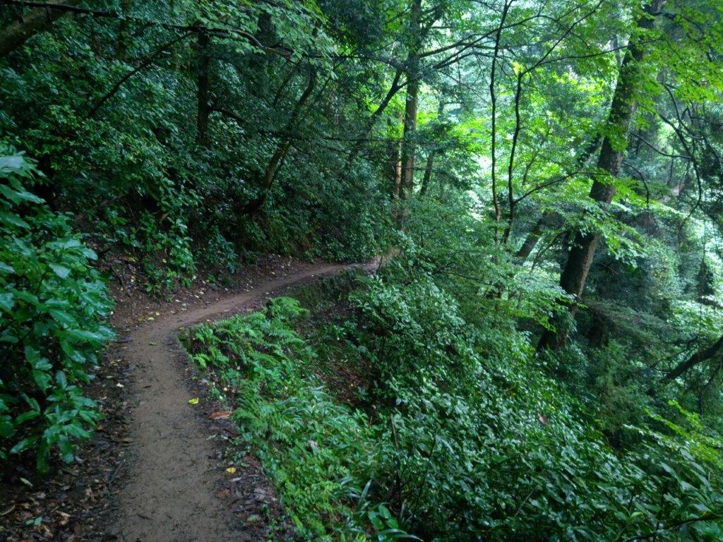 A few raindrops fell as I got off the train at Takao station just past 2pm, but fortunately nothing was falling as I got off at Hikage (日影), ten minutes away on a mostly empty bus. I continued up the main road for a few minutes before turning left and passing over a bridge; I then followed a narrow road alongside Hikage-sawa stream (日影沢). The pleasing rushing sound of the water made up for the gloomy skies overhead. At the Hikagezawa Camping Ground, I turned left onto the Iroha Forest Trail (いろはの森コース). Soon the path started to climb through thick forest, the sound of water slowly fading.
