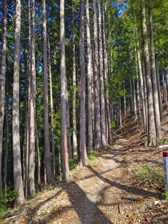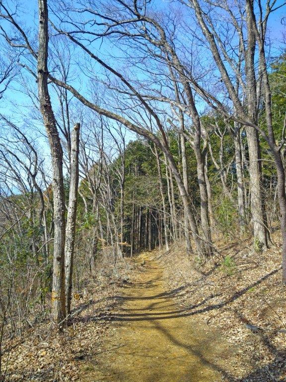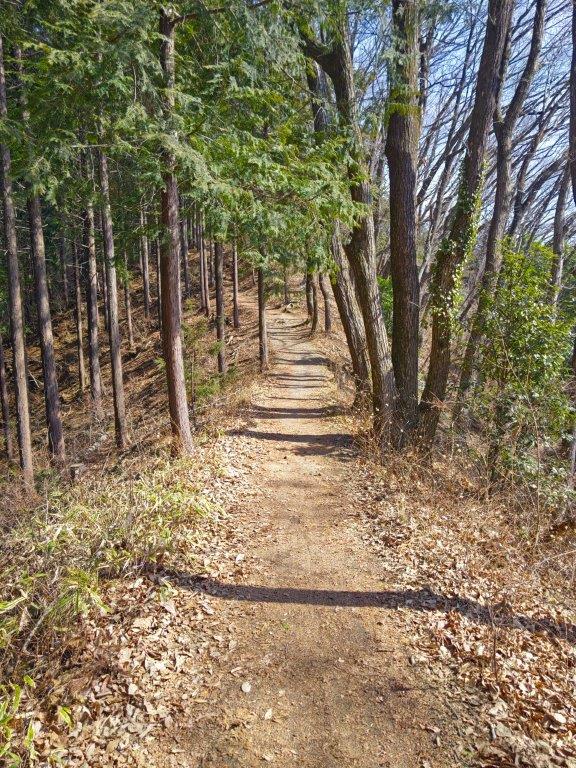 Mt Fuji was half-hidden by the midday haze due to temperatures topping 20°C in the valley below, but I was still able to admire its perfect snowcap in this season. Westwards, I could see the ridgeline extending towards Mt Shoto, looking very inviting on this fine day; to the north, I could see the Okutama mountains, including Mt Odake and Mt Gozen; on the east side, the Kanto Plain extended into the distance, the Tokyo skyscrapers barely visible. At 12:30, I set off for Meiou Pass, but soon turned right onto a smaller path, leaving the crowds behind. I was now following the Tochitani Ridge Route (栃谷尾根コース) down the mountain.