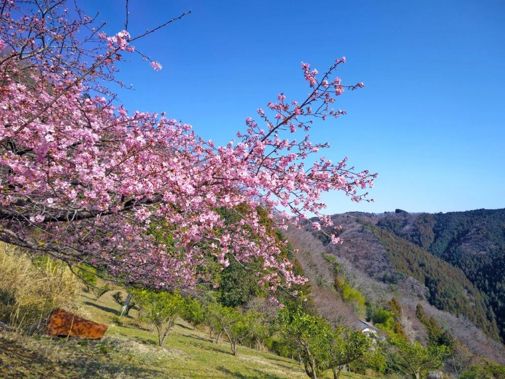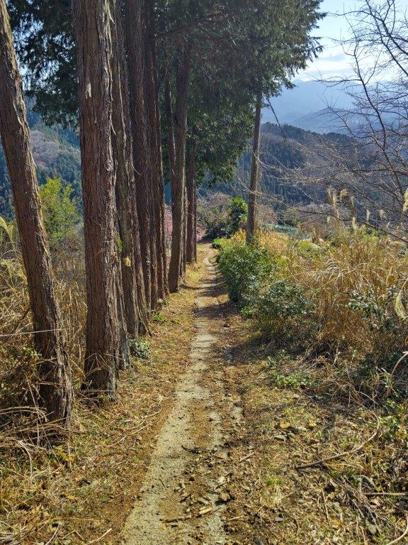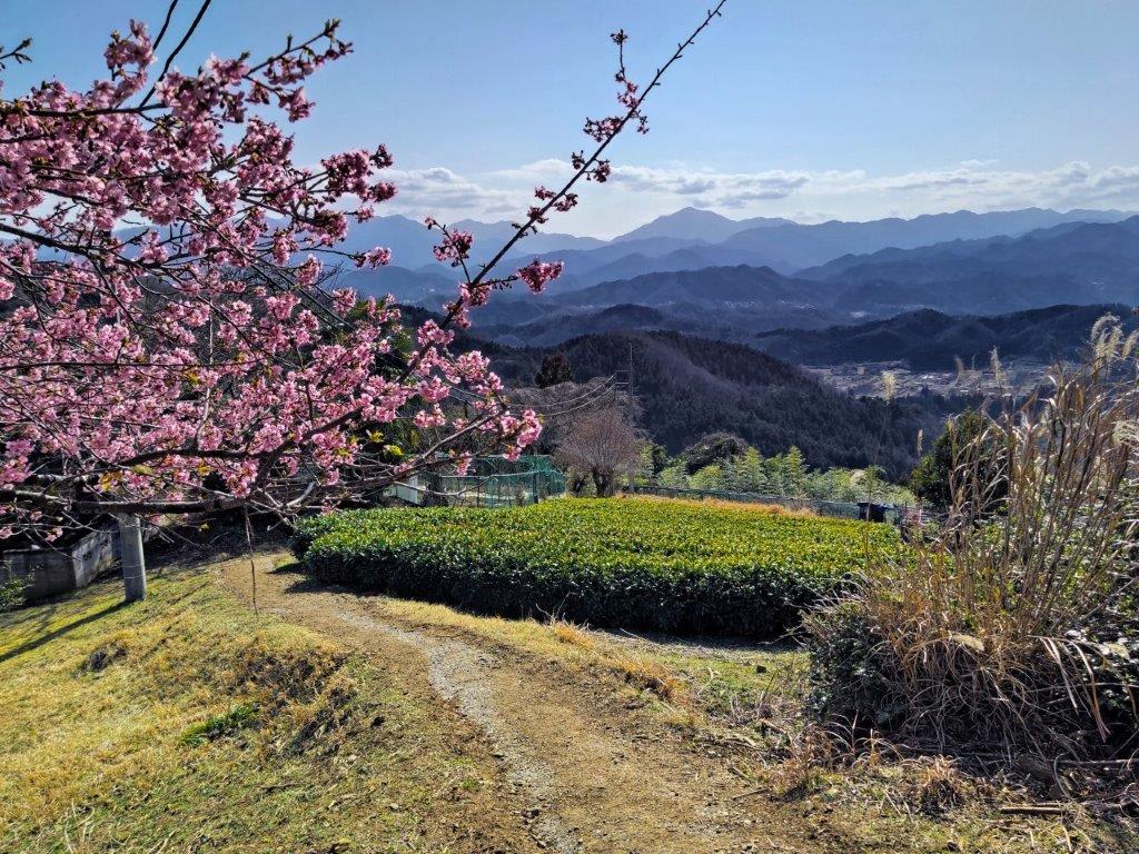 The trail descended steeply through cedars for a while before reaching a level section; beyond, the narrow trail descended more gently but remained inside the tall cedars, keeping me out of the afternoon sun but hiding most views. I passed few people on the way, allowing me to enjoy the solitude of the mountain. At a small Inari shrine, I made a sharp left turn. I soon emerged from the forest above some tea fields and had a wide view of the Tanzawa mountains to the south. I was against the sun, but could distinguish Mt Oyama, Mt Tanzawa, Mt Hiru, Mt Hinokiboramaru and Mt Omuro; in the foreground, I could also see the Doshi mountains, the Hizure Alps and Mt Sekiro. On the left side of the trail was a Kawazu-zakura (河津桜), an early flowering cherry blossom tree, in full bloom, its pink petals swaying in the breeze.