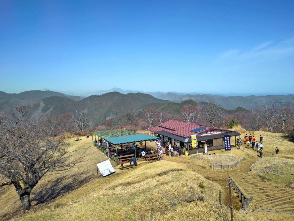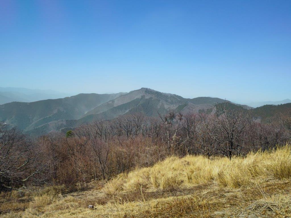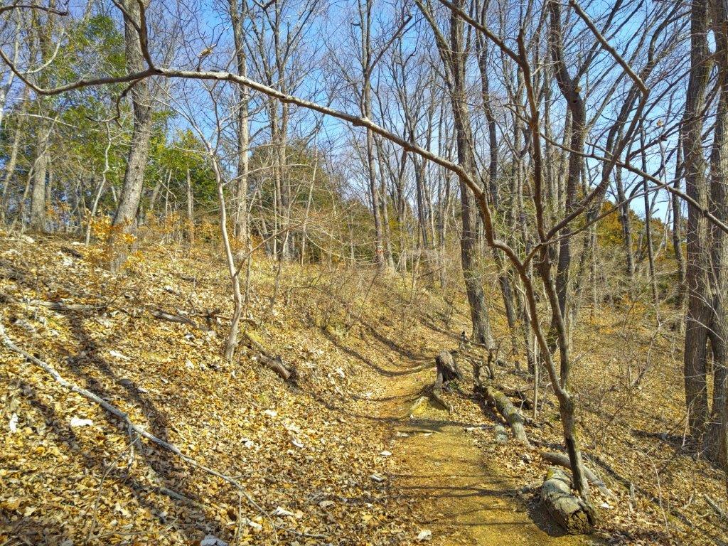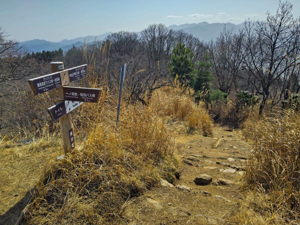 Mt Fuji was half-hidden by the midday haze due to temperatures topping 20°C in the valley below, but I was still able to admire its perfect snowcap in this season. Westwards, I could see the ridgeline extending towards Mt Shoto, looking very inviting on this fine day; to the north, I could see the Okutama mountains, including Mt Odake and Mt Gozen; on the east side, the Kanto Plain extended into the distance, the Tokyo skyscrapers barely visible. At 12:30, I set off for Meiou Pass, but soon turned right onto a smaller path, leaving the crowds behind. I was now following the Tochitani Ridge Route (栃谷尾根コース) down the mountain.