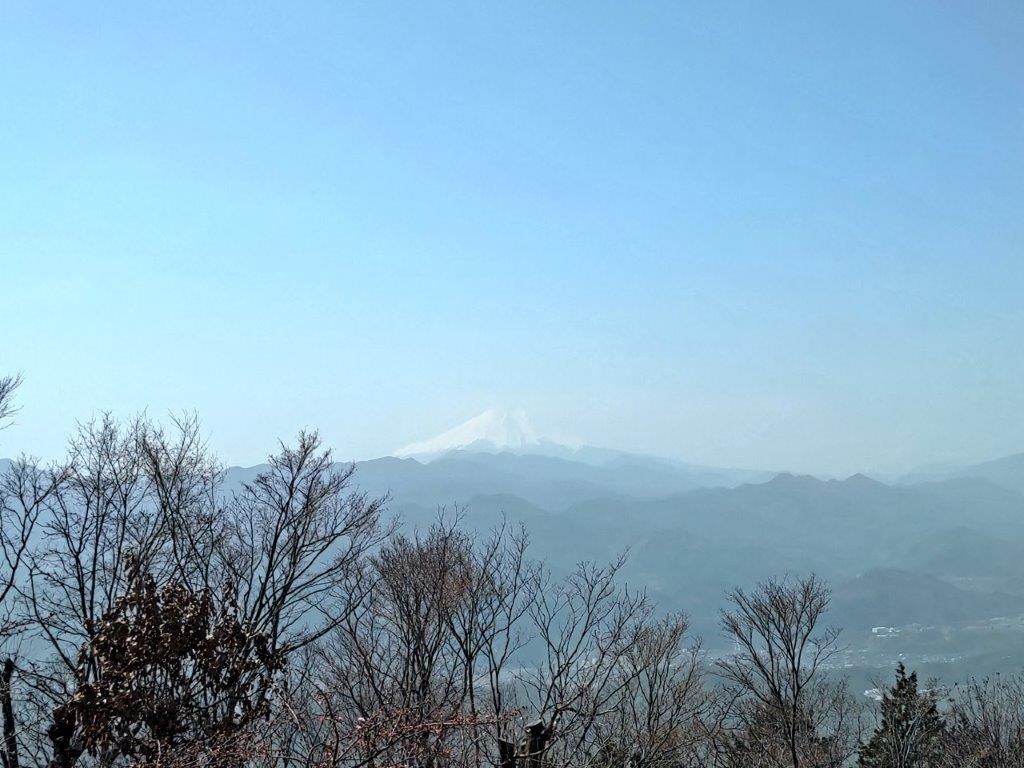 I was surprised to see no one on the trail on this beautiful spring day, probably due to the high levels of cedar pollen in the air. After half an hour of gentle climbing, I turned left onto the wider Ichi-no-O Ridge Trail (一ノ尾尾根コース). From this point, I occasionally passed hikers going up and down, but most of the time I had the sunny trail to myself, the mixed forest still leafless in this season. The path alternated between level and climbing sections; turning around in the middle of a slope, I could make out Mt Fuji through the bare trees. An hour and a half after setting off, the trail merged with the the Wada Ridge Route #2 which I had used a couple of years ago.