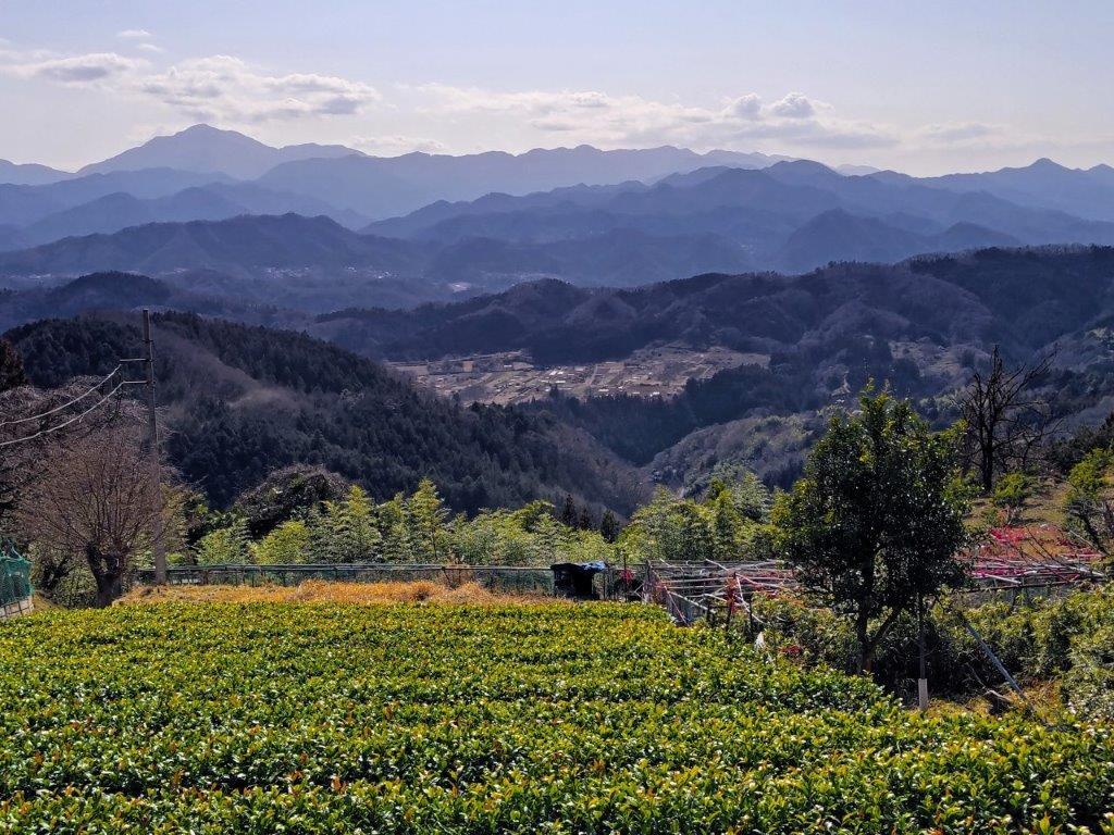 The trail descended steeply through cedars for a while before reaching a level section; beyond, the narrow trail descended more gently but remained inside the tall cedars, keeping me out of the afternoon sun but hiding most views. I passed few people on the way, allowing me to enjoy the solitude of the mountain. At a small Inari shrine, I made a sharp left turn. I soon emerged from the forest above some tea fields and had a wide view of the Tanzawa mountains to the south. I was against the sun, but could distinguish Mt Oyama, Mt Tanzawa, Mt Hiru, Mt Hinokiboramaru and Mt Omuro; in the foreground, I could also see the Doshi mountains, the Hizure Alps and Mt Sekiro. On the left side of the trail was a Kawazu-zakura (河津桜), an early flowering cherry blossom tree, in full bloom, its pink petals swaying in the breeze.