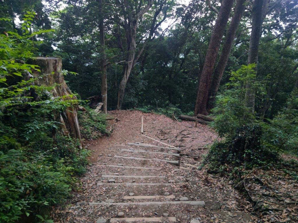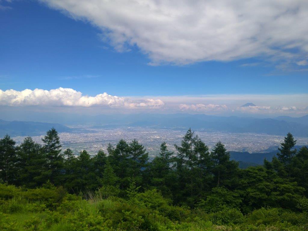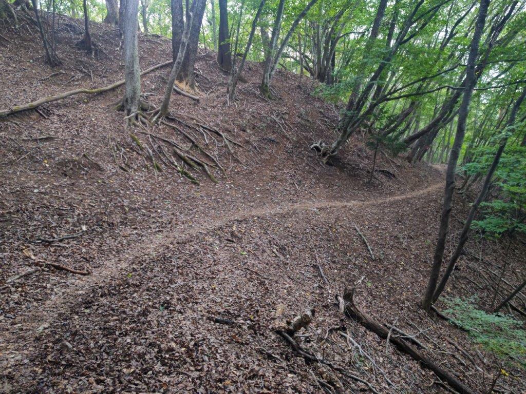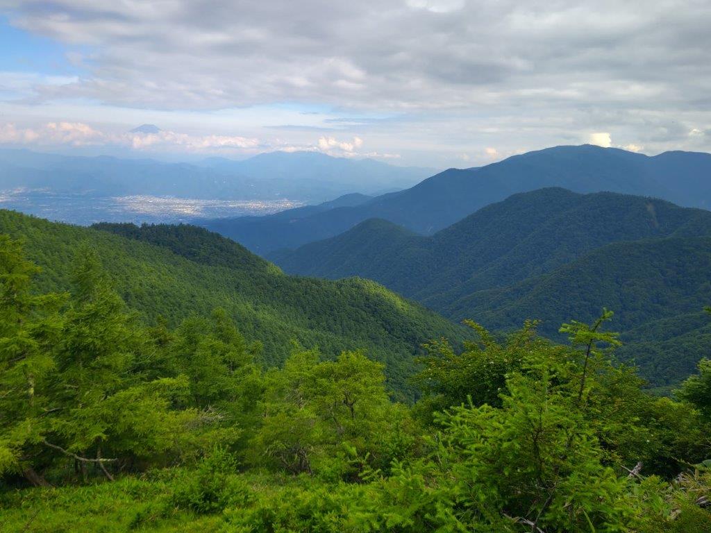 I was surprised to see that thick clouds had rolled in during my ascent, completely hiding Mt Fuji from view. According to the other hikers, I had missed Japan’s iconic volcano by only a few minutes. Looking down, I still had a view of Kawaguchiko lake extending east to west along the base of the mountains. On the right side, I could see Mt Ou and Mt Setto, two other main peaks of the Misaka mountains. I decided to skip my planned lunch break and immediately head to the next summit, in hope that the clouds would have cleared by then. I retraced by steps and headed down a steep path on the west side; beyond Suzuran Pass (すずらん峠), the path became level and easy to walk.