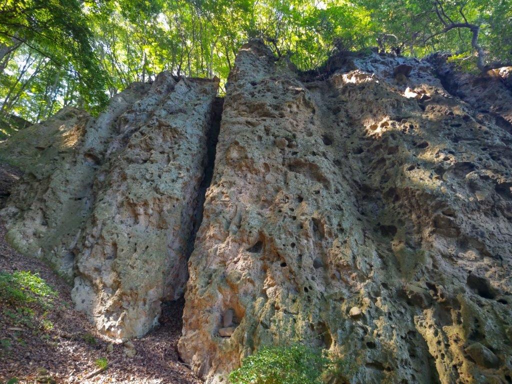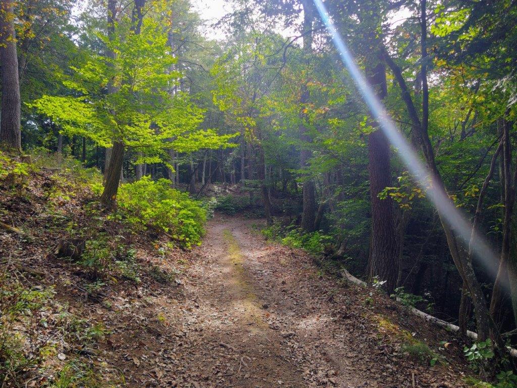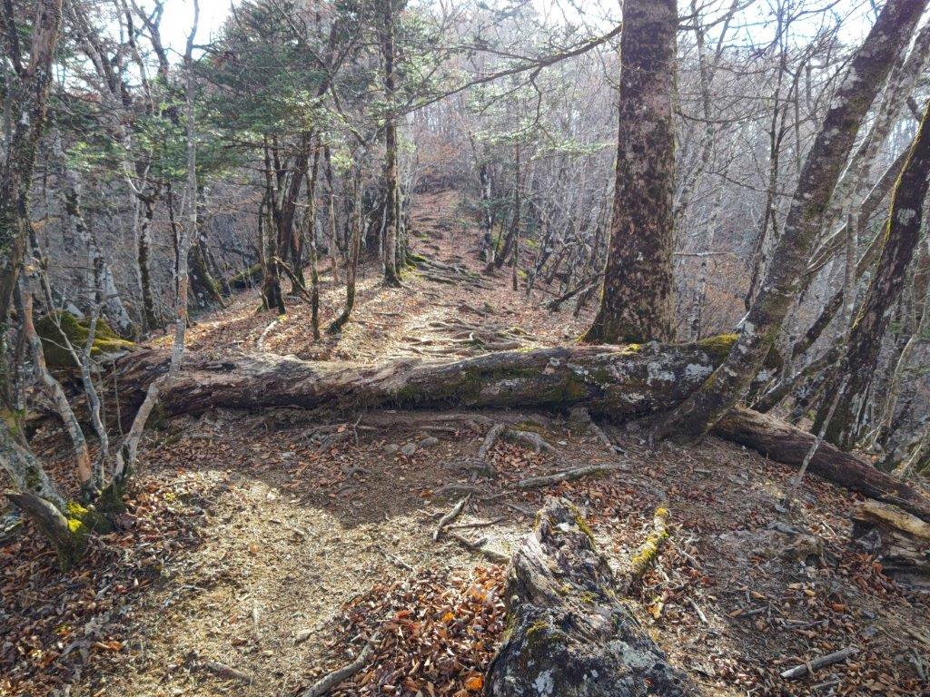 I found myself walking among tall beeches, their tops already bare of leaves, drawing attention to their white trunks. After recrossing the dry riverbed, I reached a paved road where I turned right and soon passed the gated entrance for the road for Fujiyama Twin Terrace, closed to private cars. A little further, I arrived at a sign for today’s mountain, pointing to a faint trail heading up the left side of the dry riverbed. Here, I was glad I could see my position on the Japanwilds digital map since the trail was at times hard to follow. At 1pm, I turned right onto a ridge, the path merging with a signposted trail leading to the summit.