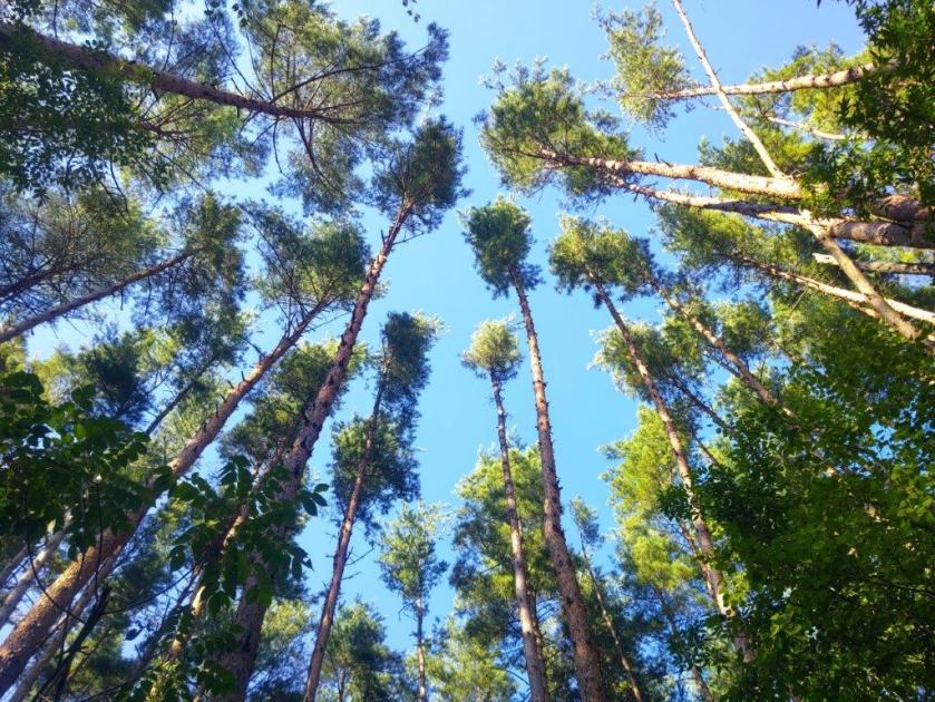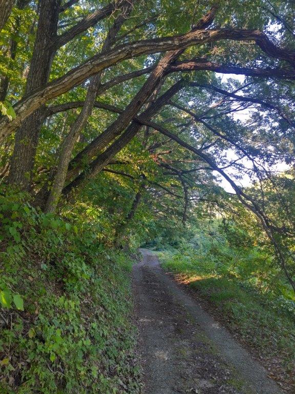 I was stunned by the view of the golden larches covering the foothills, enhanced by the late afternoon sun rays, although Fuji was still stubbornly in the clouds. I made my way to the first terrace, just a few meters away; it was deserted of people, tall pines slightly in the way of the perfect view. It was nearly 3pm, a couple of hours before dark, so I gave up on seeing Japan’s highest mountain and headed down via a paved road, moving to the side once to let the bus pass. Fifteen minutes later, I turned left onto the trail from Suzuran Pass; after descending through dark cedars, I reached a small road the second parking for hikers.