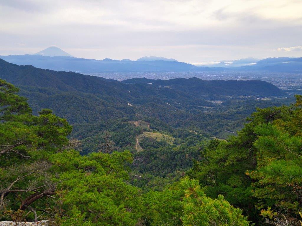 I made good time up the steep trail allowing me to stay warm in the frigid temperatures. I was above 1000 meters and Autumn was already well over, the white beeches providing most of the scenery; a sign indicating told me I was inside a 100 famous forest of Yamanashi. The trail gradually became less steep, giving me a chance to catch my breath without having to take a break. After a couple of turns, I suddenly came upon the summit of Mt Kuro (黒岳 くろだけ kuro-dake meaning “Mt Dark”), the highest peak of the Misaka mountains and a 300 famous mountain of Japan. It was completely in the trees so I dropped my pack and headed for the observation point a few meters to the right, hoping to get a glimpse of Mt Fuji.