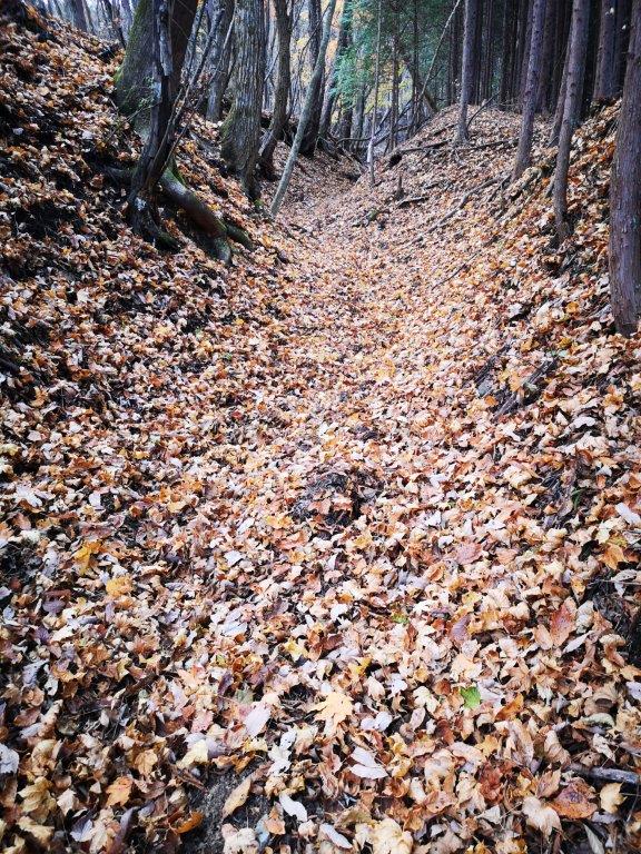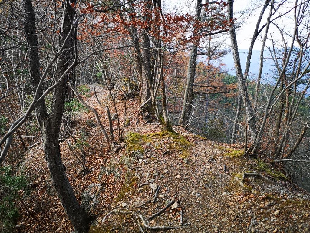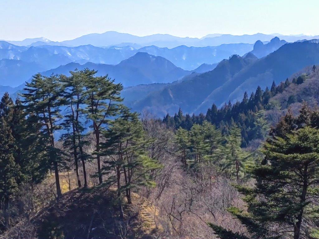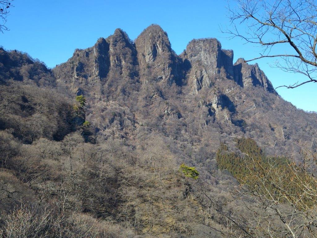 I was rewarded with a striking view of Mt Souma, the south side of Mt Myogi and its highest peak, the best view of the day. Since I was on schedule, I took some time to walk along the road above the park to get some more views of the mountains of Nish-Joshu; I could see all the way from Mt Mikabo on the eastern side to Mt Arafune on the western side. At 3pm, after crossing the road, I was back on a hiking path for Myogi Shrine along the Fureai no Michi, heading down a steep, rocky trail, now in the afternoon shade. Very soon, I reached another viewpoint of Mt Souma, this time from below; fortunately, the rocky face was sill bathed in the late-afternoon sunlight.