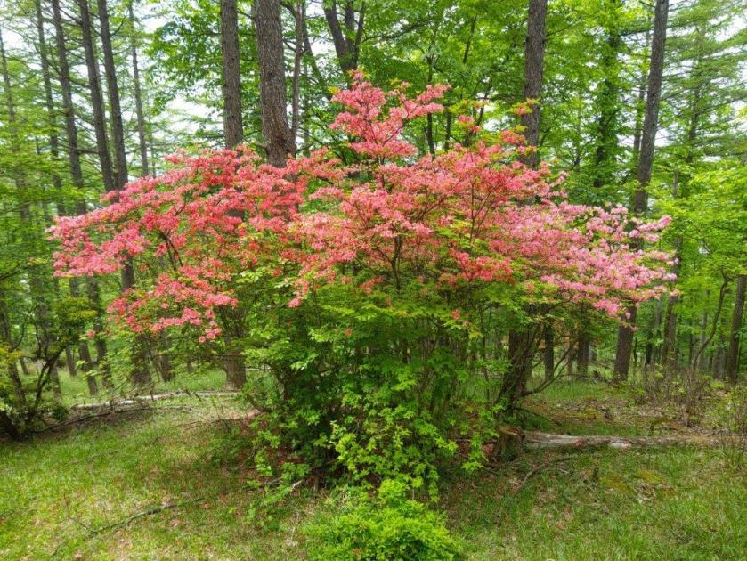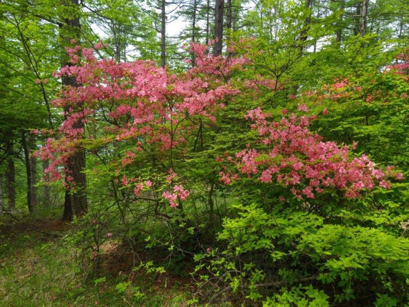 I was amazed by the sea of pink spreading down into the valley. Opposite was Mt Ogeta; on the south side, I spotted the triangular shape of Mt Inafukumi, and northwards, I could make out one of Mt Myogi’s many peaks. After a short break, I headed down via a different path, and half an hour later, joined up with the Fureai no Michi, descending from Mt Ogeta on the right. I was now heading north along a road connecting Shimonita with Matsuida, but soon turned left onto a smaller road leading up a valley. On the left side, beyond a stream, I could see the higher slopes of Mt Mido. At noon, I arrived at the Nakamura bus stop, where I turned right, heading up a small mountain road with almost no traffic.