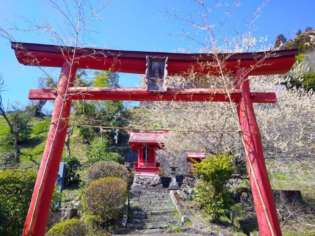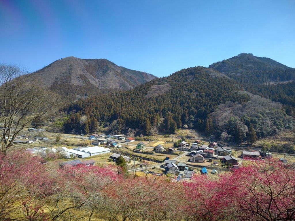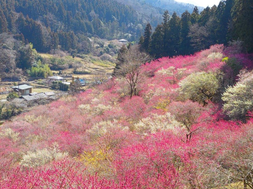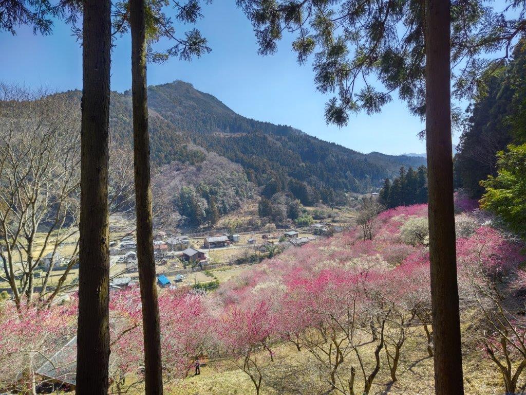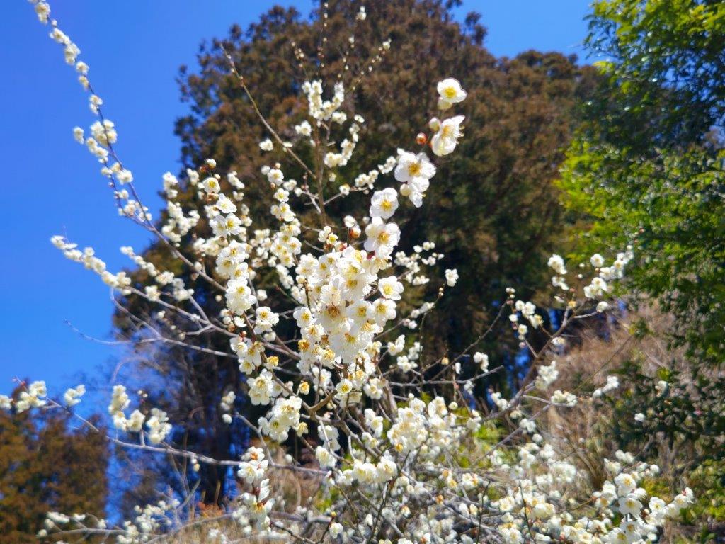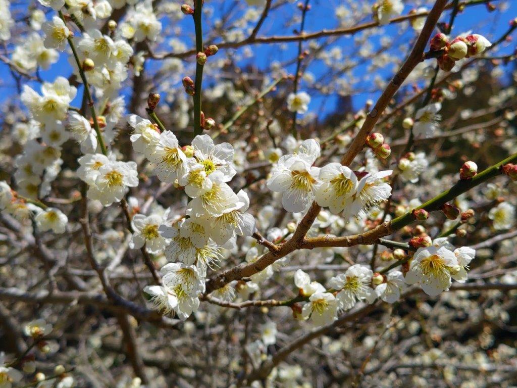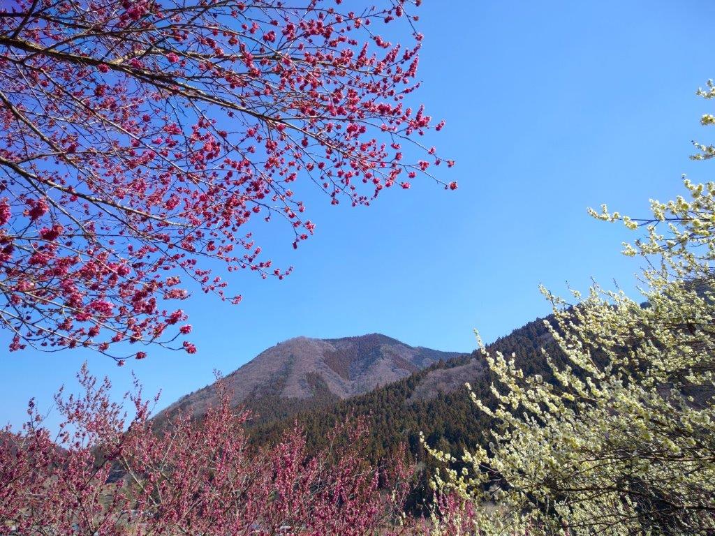 Surprisingly, almost all seats on the Joshin Electric line were taken upon leaving Takasaki station, although most passengers got off well before Shinomita, the final station on the line. After a short taxi ride, I was at the entrance of Fukujuso no Sato (寿草の里), a little past 10am. After getting reading for hiking, I made a small donation at the front gate and entered the plum blossom garden, the last day of the year it was open to the public. I made my way along a path under white and red blossoms, slowly heading up the mountain side; at 11am, I reached a viewpoint at the highest point of the garden.