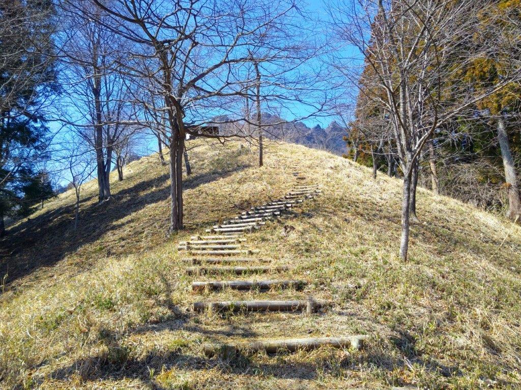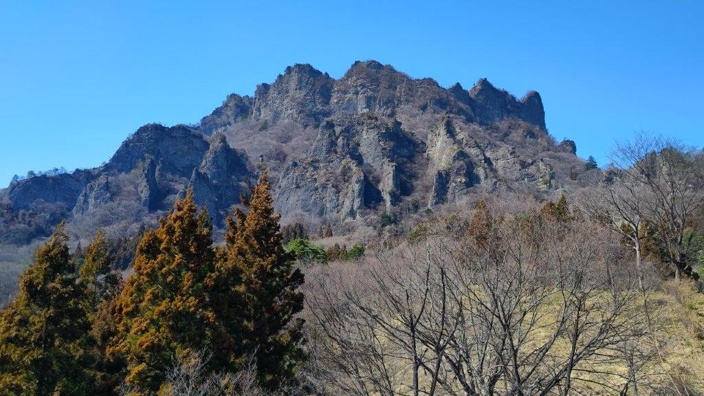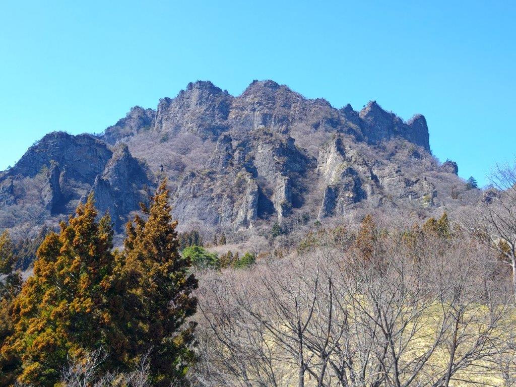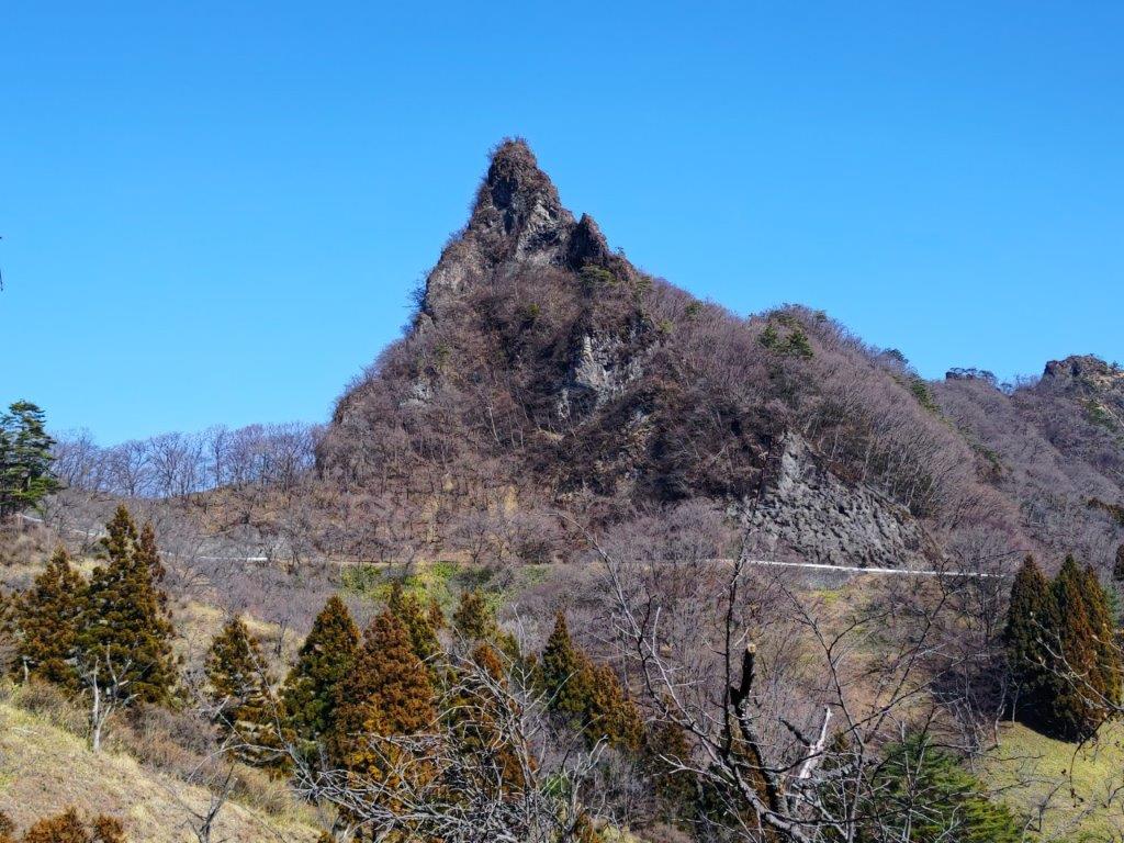 I was stunned by the impressive view of the long mountain ridge separating Gunma and Saitama, still covered in snow; I had climbed many of these peaks, including the highest one, Mt Akaguna; in the foreground, I could see Mt Ogeta and Mt Mido. A few more minutes up some log steps brought me to an open shelter with a dramatic view of Mt Kondo, the north side of Mt Myogi. Since it was just past 1pm, I settled down for lunch. At 2pm, I resumed my hike and made my way to the rest house at the highest point of the park. Along the way, I had some excellent views of the nearby Hitto-Iwa (筆頭岩 826m), a mini-version of the Matterhorn. Although the trail to the summit is closed, I could follow it all the way to the base of the rocky summit.