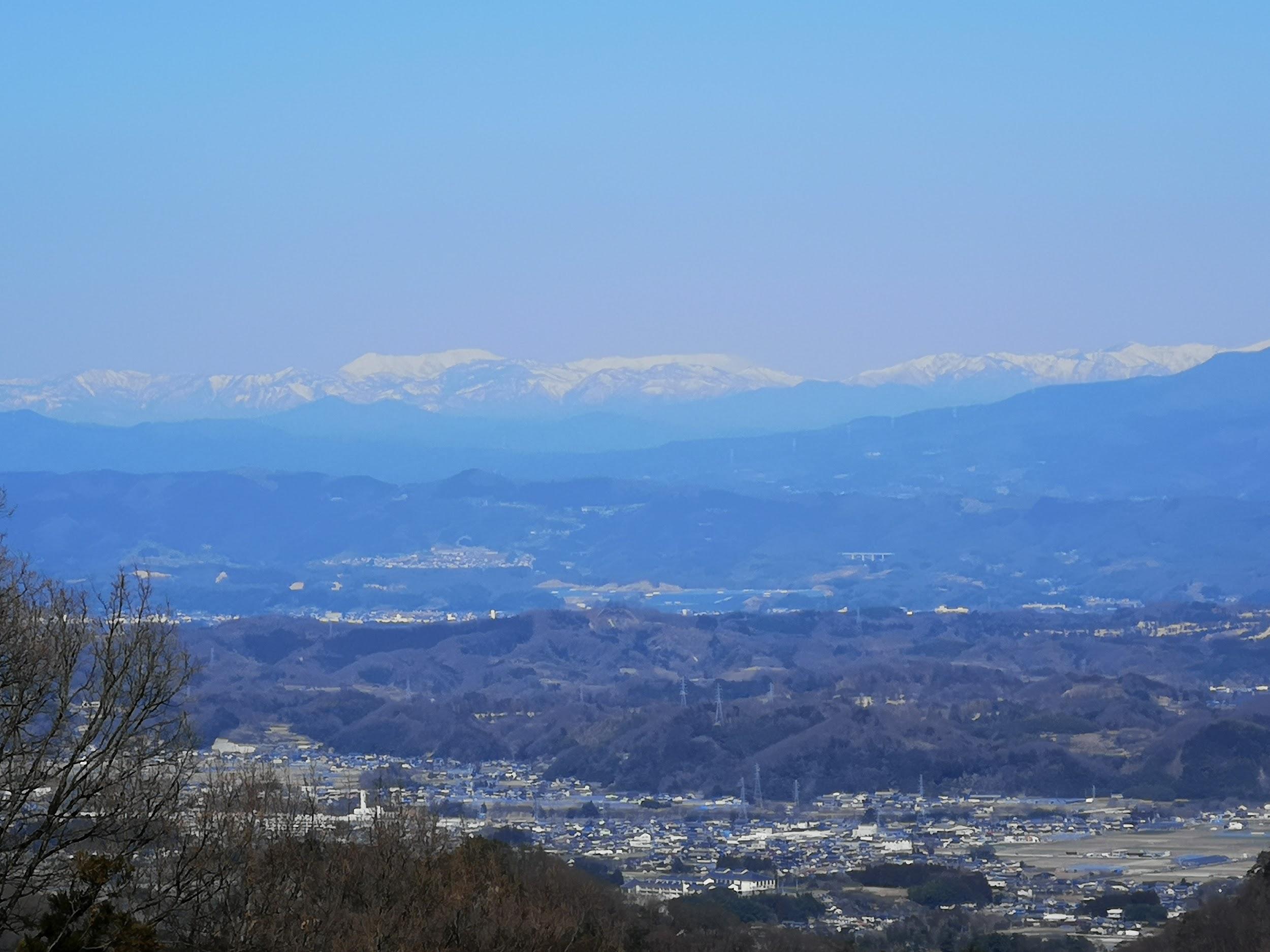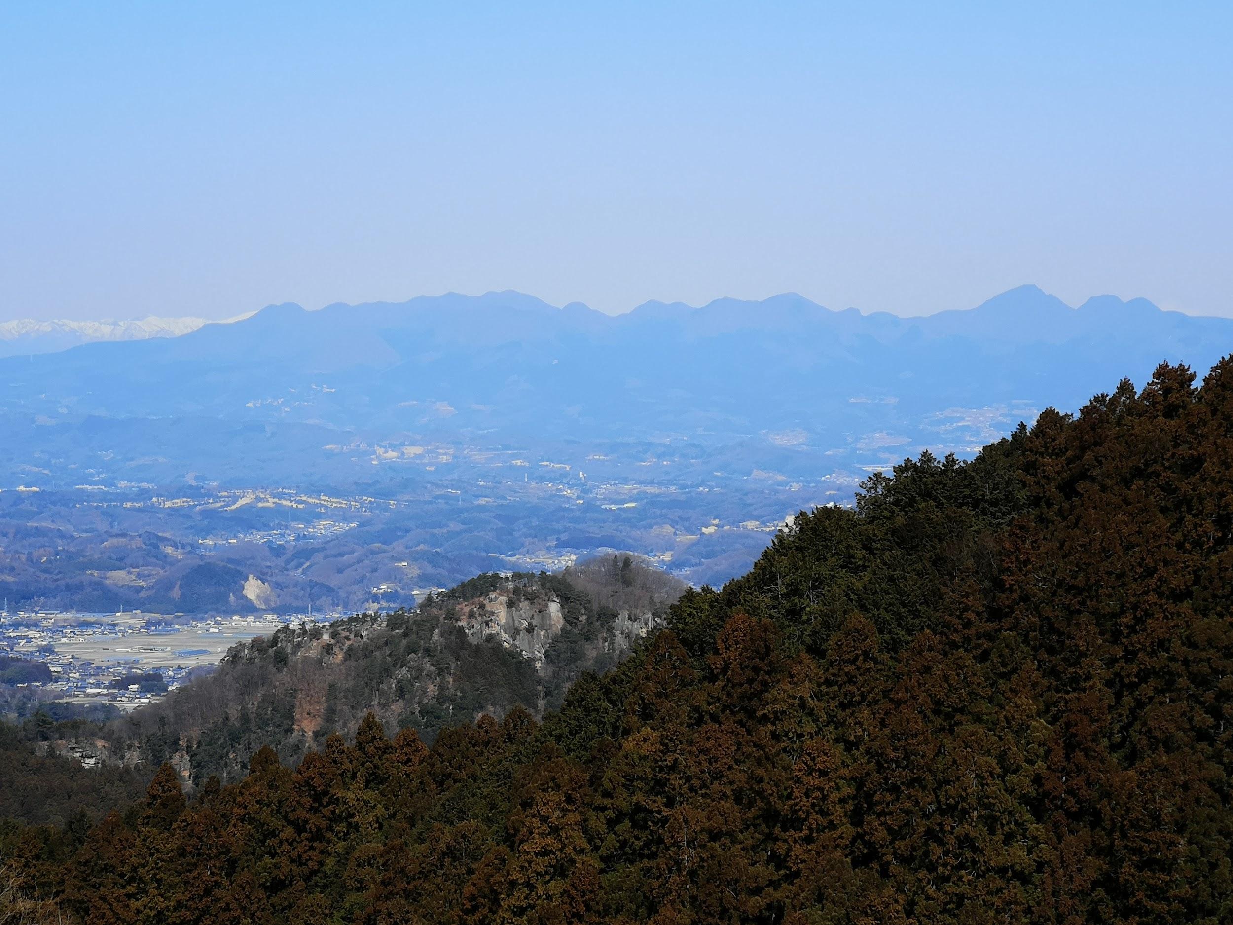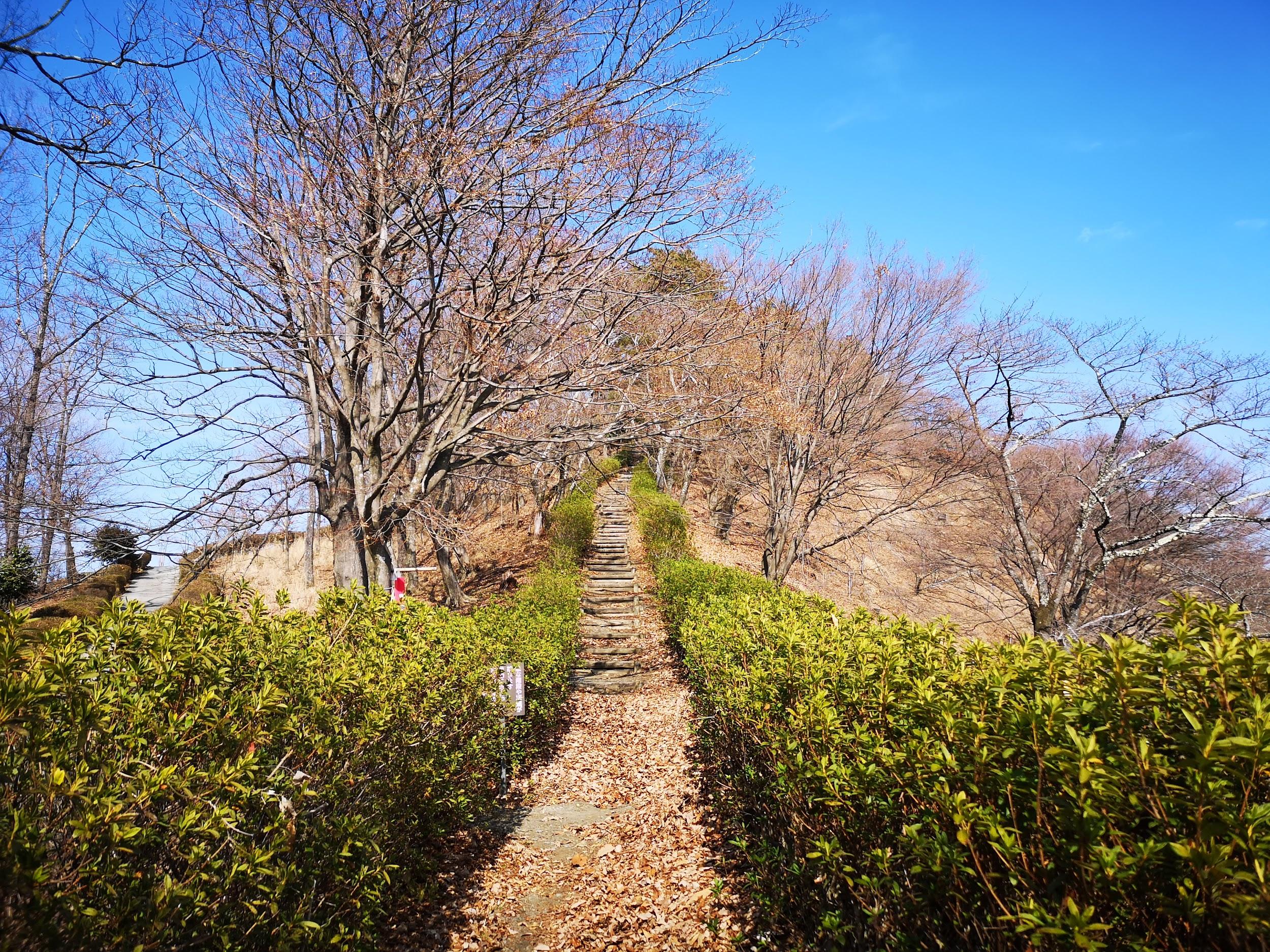 After a short climb, I arrived at a flat space, mostly free of vegetation on the southwest side, the top of Mt Amagoi (雨乞山 あまごいやま amagoi-yama), a fairly common mountain name in Japan, meaning “begging for rain”, something I definitely didn’t want to do, today being a perfect blue-sky day. Mt Akagi took up most of the south side; southwest was Mt Komochi again; I now had a new view on the west side where I could see the flat top of Mt Mitsumine, with behind, the highest peaks of the Joshin’Etsukogen National Park, most of them still in their winter clothes. Mitsumine is a popular paragliding spot and I happened to see a paraglider drift through the sky. It was exactly 1pm, so I sat on a bench and enjoyed lunch with a view.