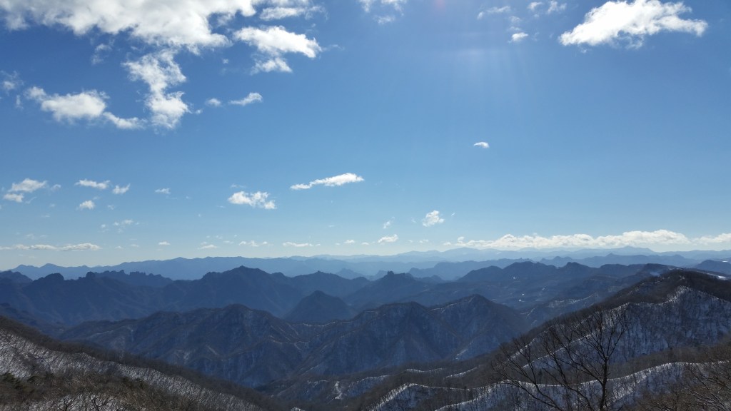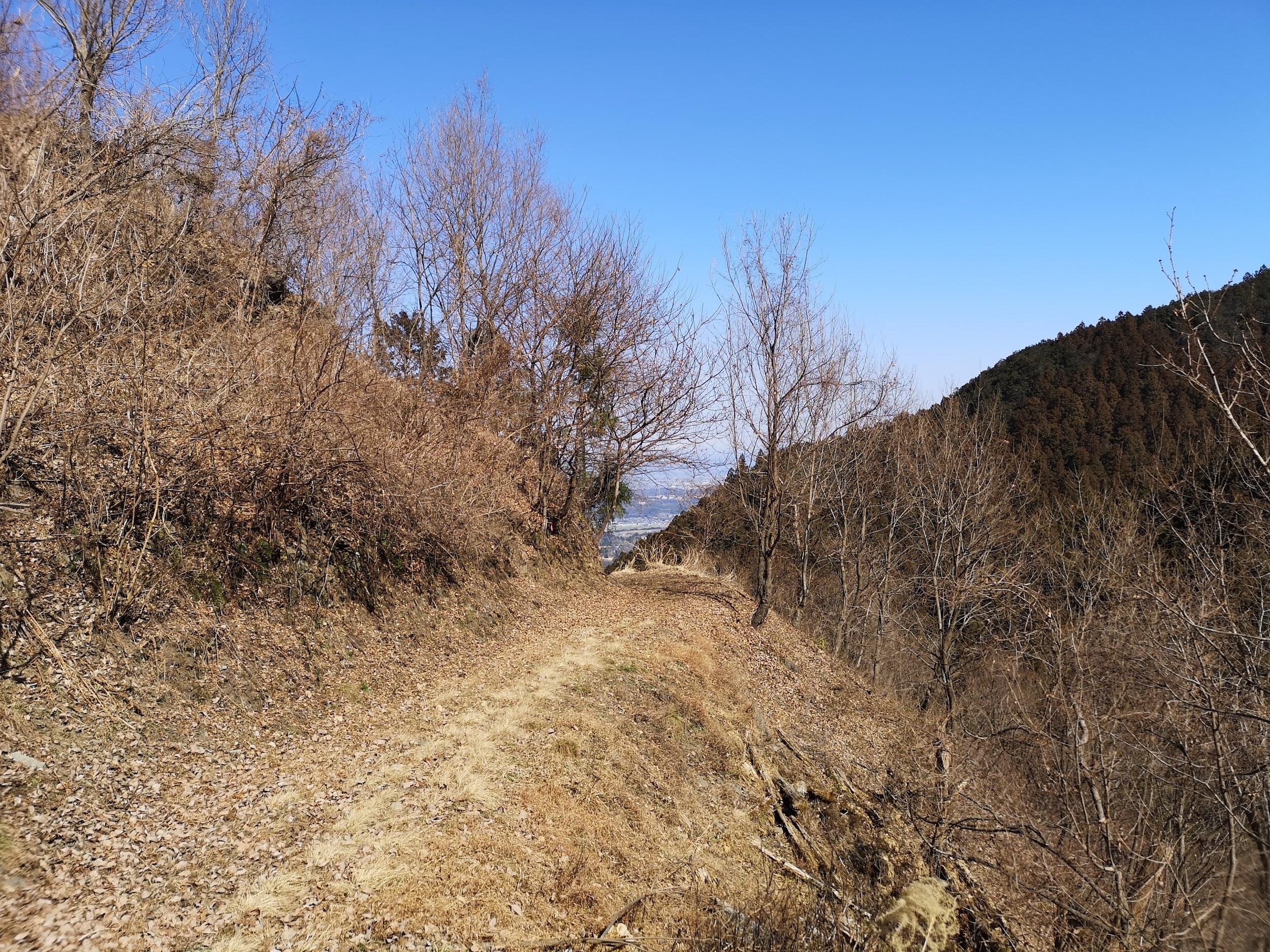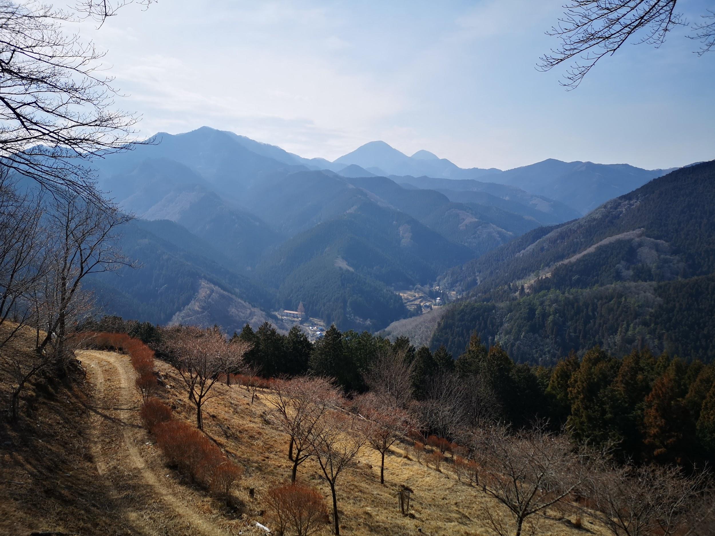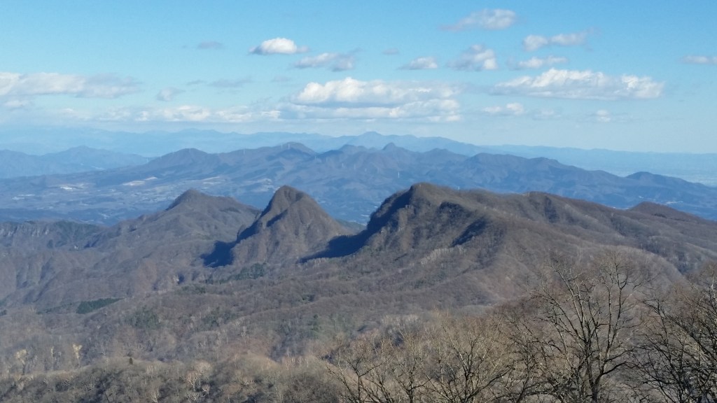 After lunch, I tried to match all the Joshin’Etsu mountains using the summit information board, since only the Tanigawa range on the very right was instantly recognisable ; apparently on clear winter days, one can also see the Chichibu Mountains, the South Alps and Yatsugatake. Although trees blocked the views in other directions, I was able to spot the still snowy top of Mt Hodaka through some bare branches on the north side, a preview of my upcoming descent. A little before 2pm, I set off again, down a steep path on the west side.